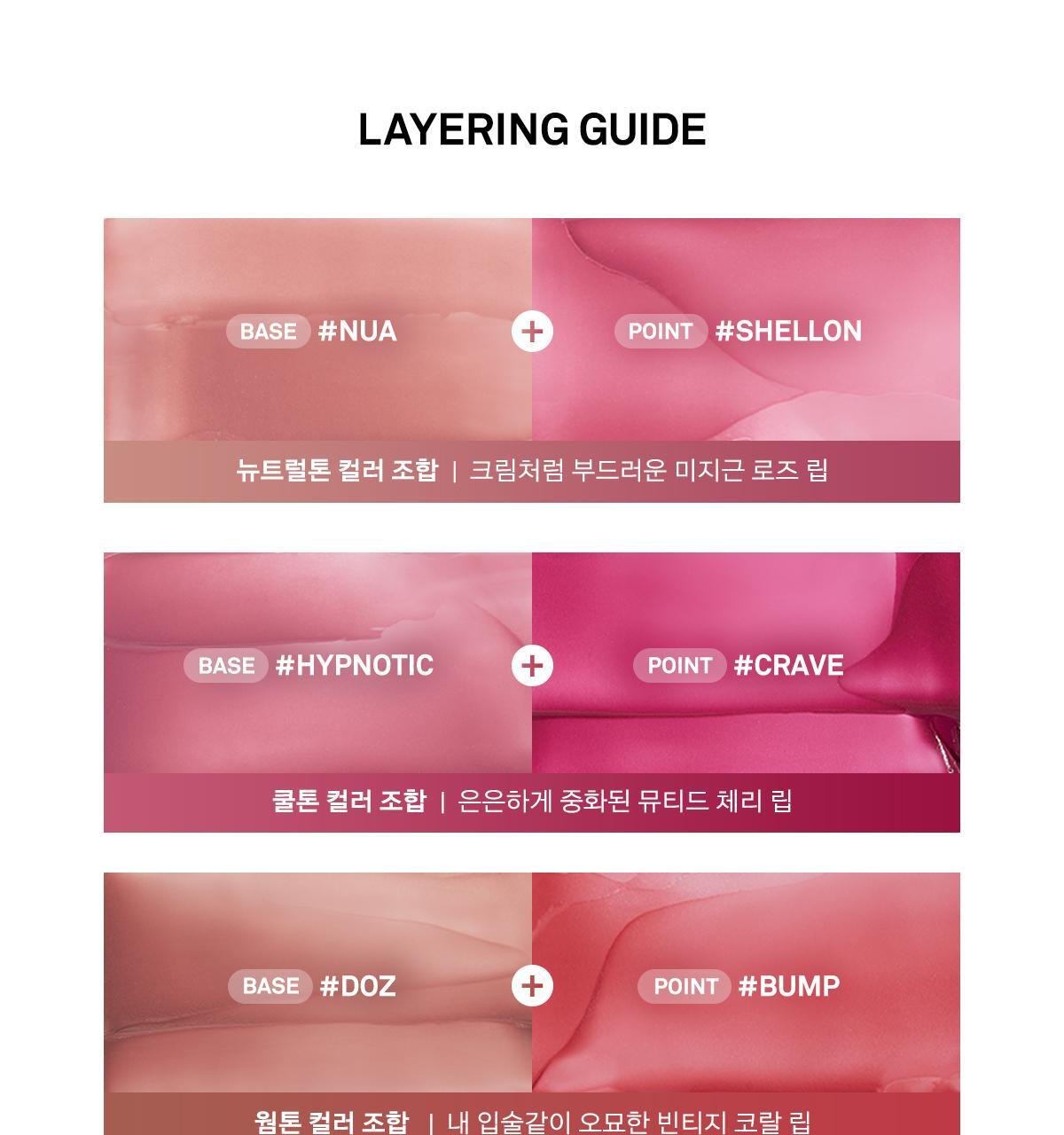 - Neutral Tone: Create a creamy, lukewarm rose lip by combining Base NUA + Point SHELLON.