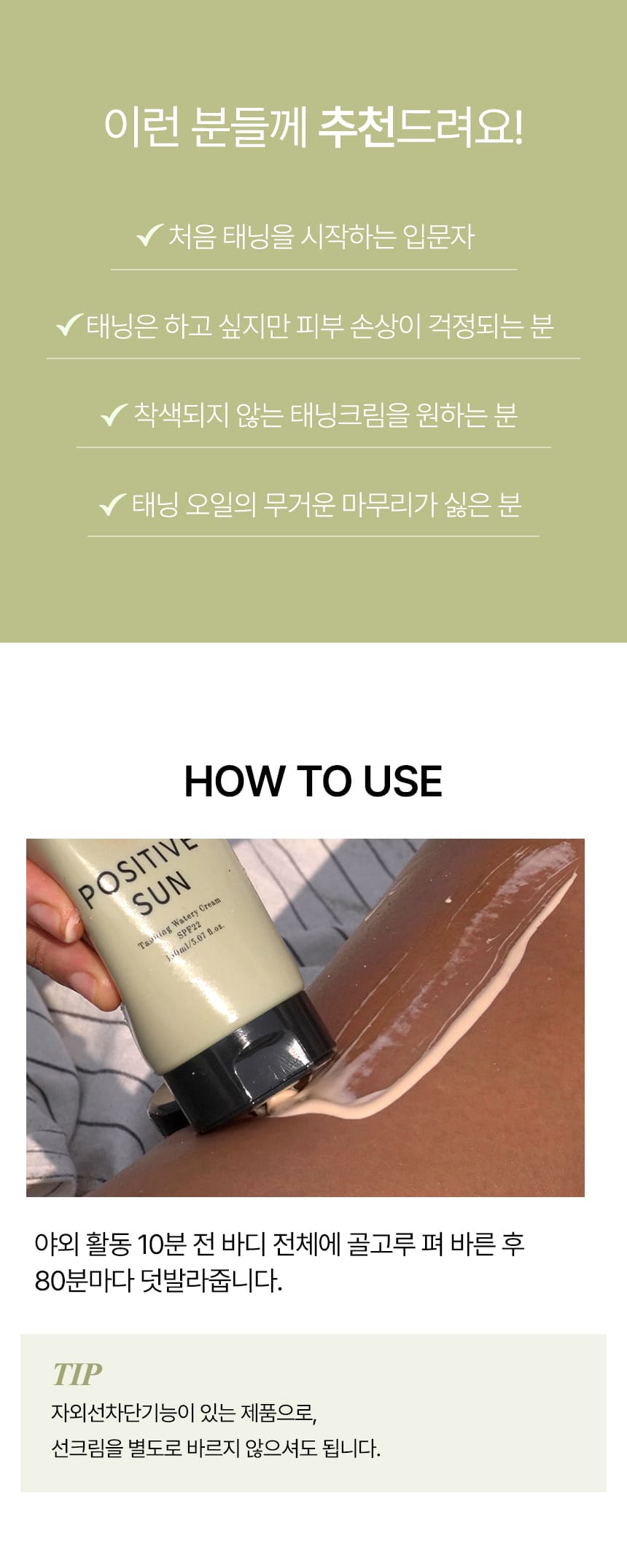 Experience a healthier, more radiant tan with shaishaishai Positive Sun SPF22, Korea’s first SPF tanning cream! Infused with ultra-hydrating ingredients, this non-sticky, lightweight lotion formula helps achieve a natural sun-kissed glow while protecting your skin from harmful UVB rays.