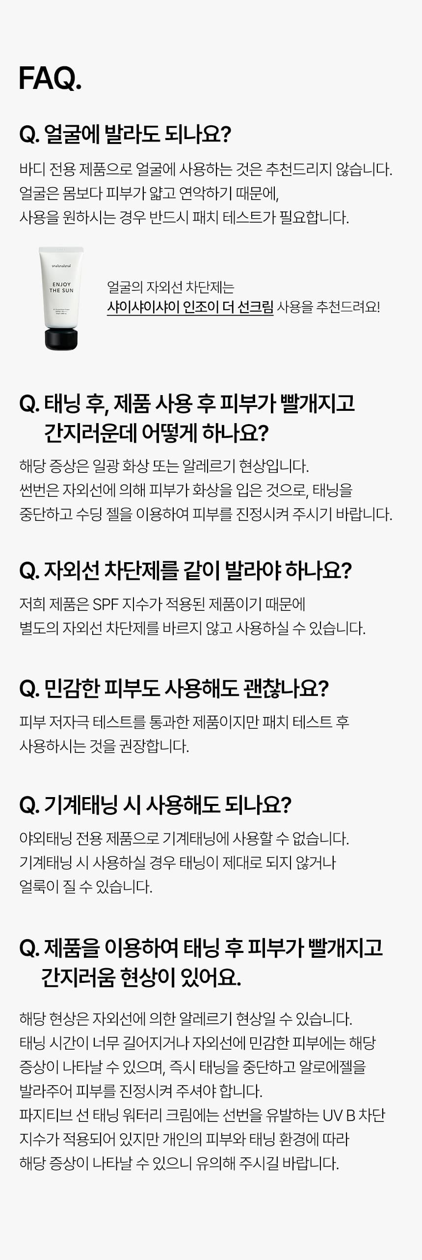 A: This product is designed for body use only. If you need facial sun protection, try shaishaishai Enjoy the Sun Cream.