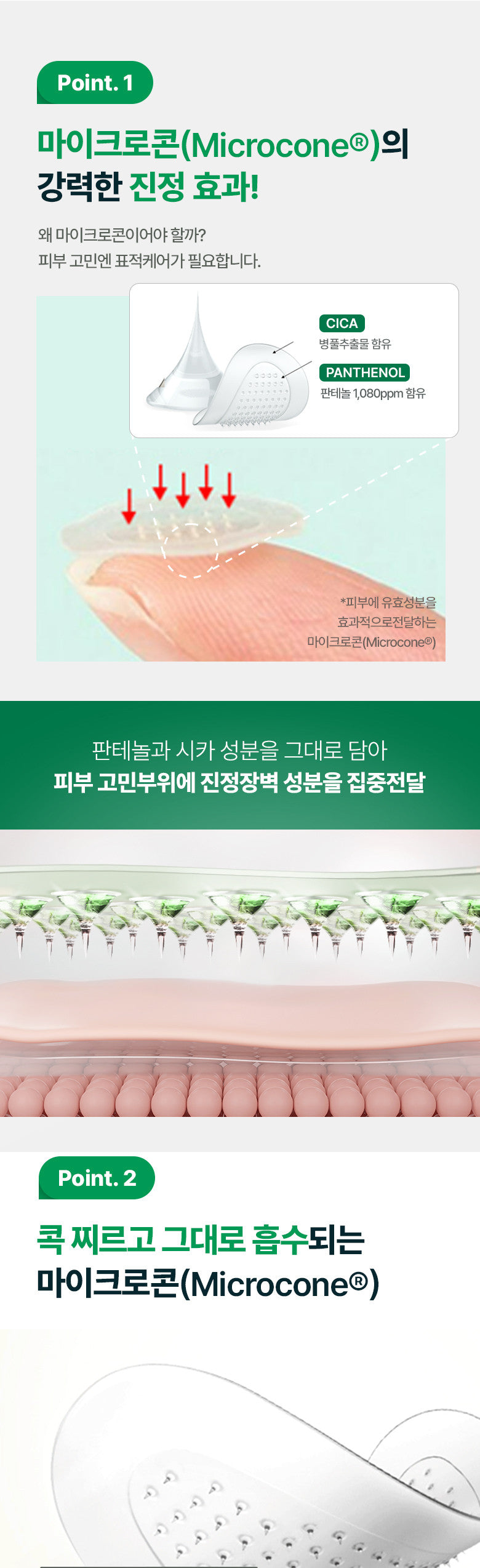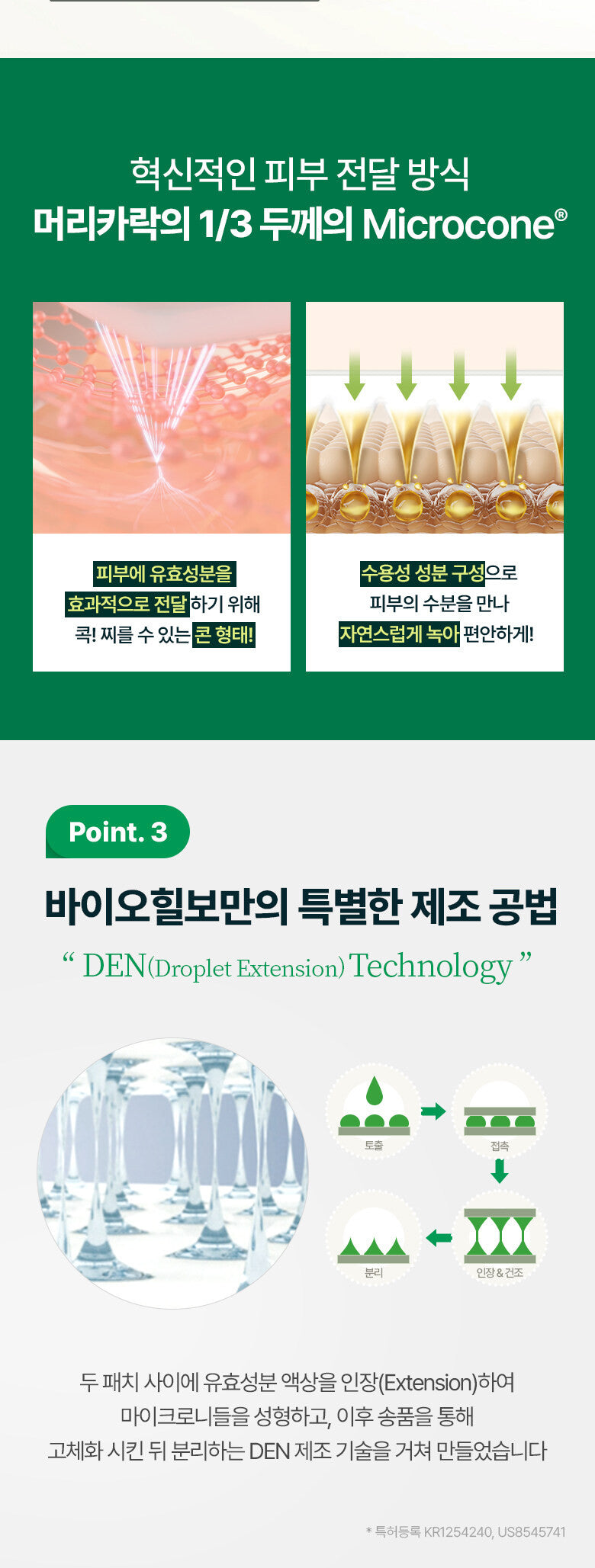 The Microcone® feature, with a thickness merely 1/3 that of a human hair, utilizes a cone shape designed to pierce gently and melt into the skin. This ensures direct absorption of the active ingredients, providing a natural and effective solution to your skincare concerns.