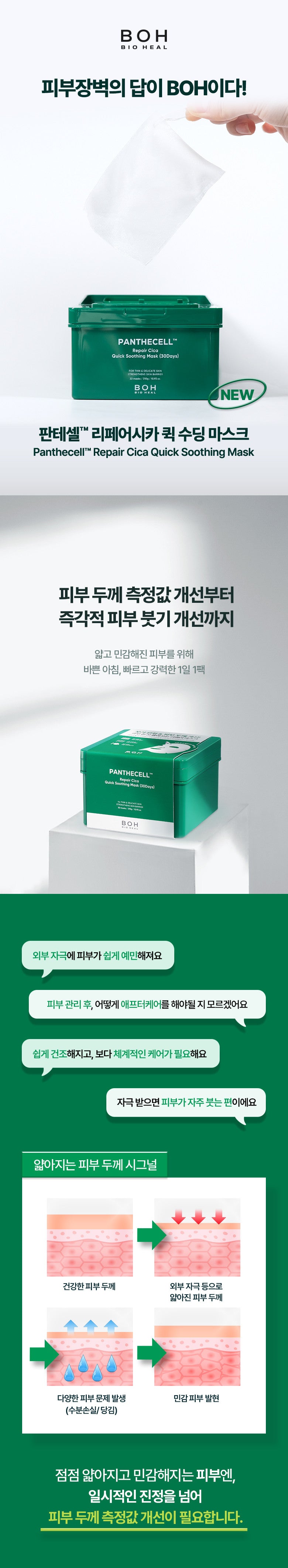 Elevate your skincare routine with the revolutionary BIO HEAL BOH Panthecell Repair Cica Quick Soothing Mask. Designed for immediate relief and long-term skin health, this product is your go-to solution for younger-looking, firmer skin. Experience an impressive improvement in skin thickness by 5.5% in just two weeks, alongside a 20% enhancement in the soothing effect to strengthen the skin barrier against environmental damage.