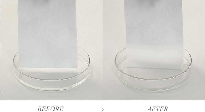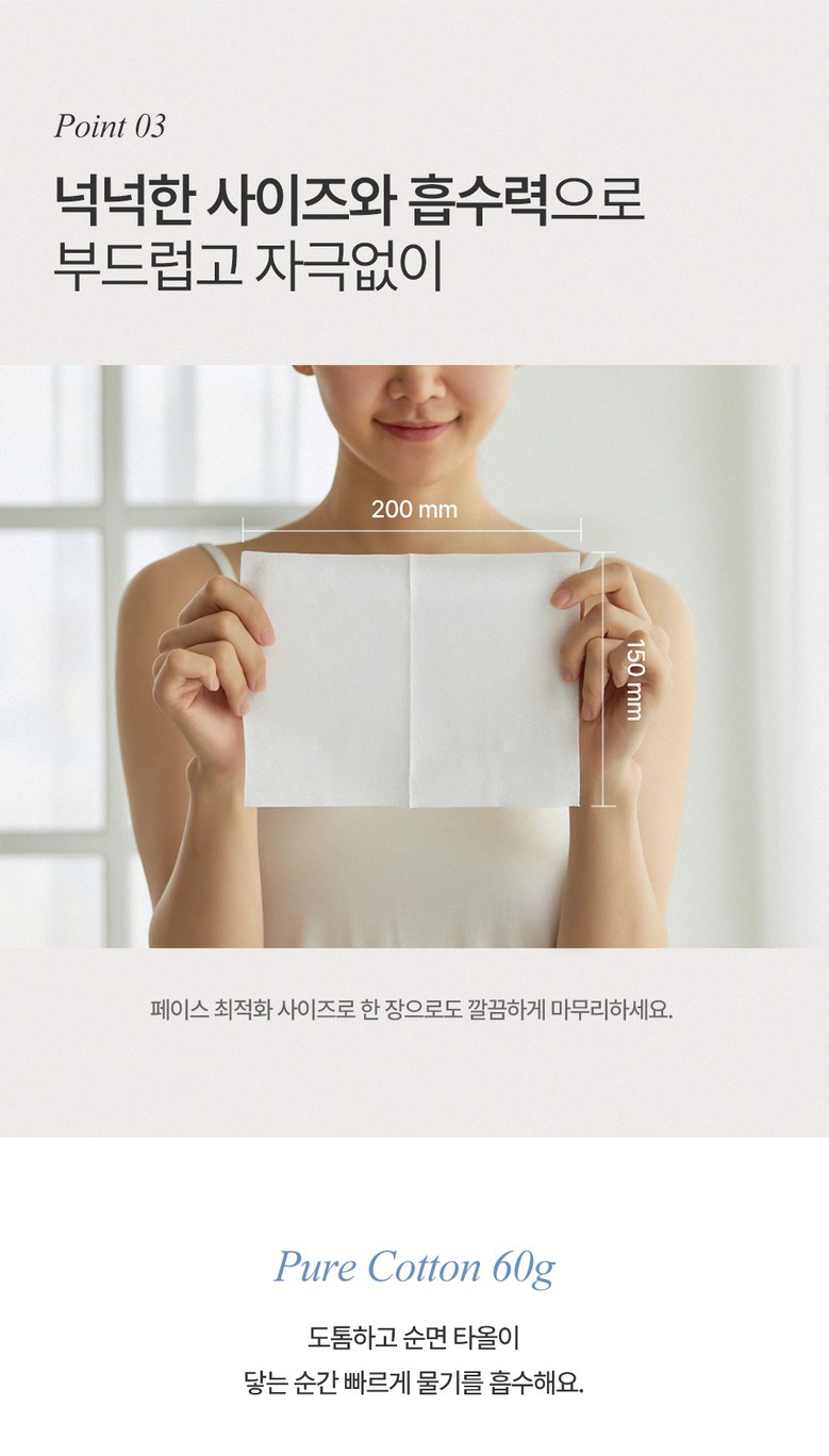 Measuring 200mm x 150mm and weighing 60g per sheet, each towel is thick and absorbent enough to dry your face with just one piece. It quickly soaks up water while cushioning the skin without friction.