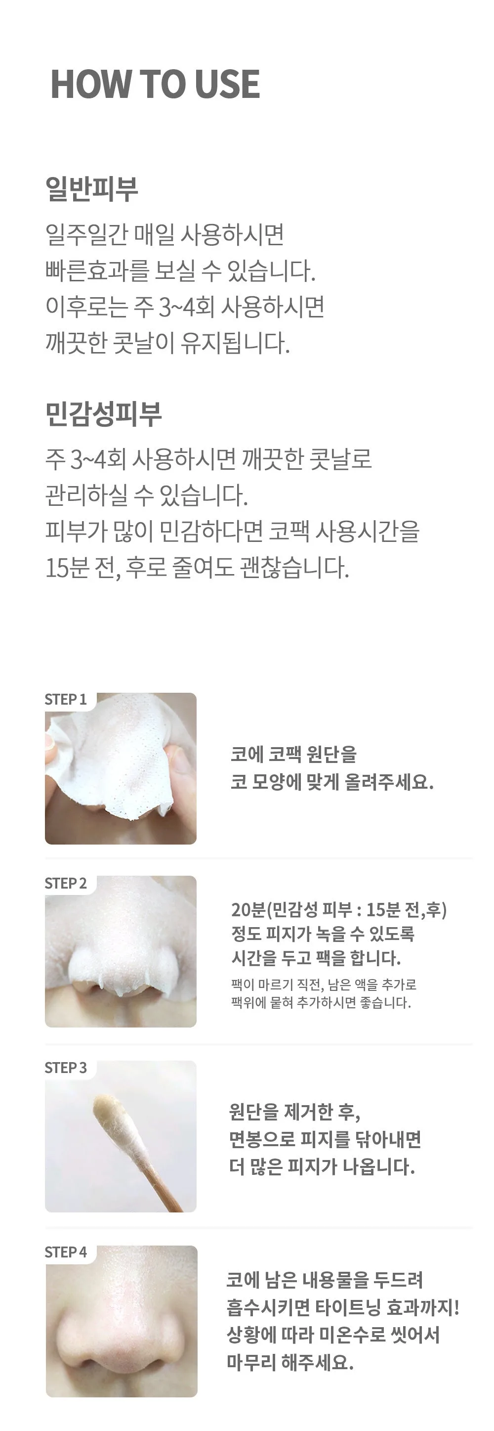 If your skin is very sensitive, it is okay to shorten the nose pack usage time to 15 minutes before or after.