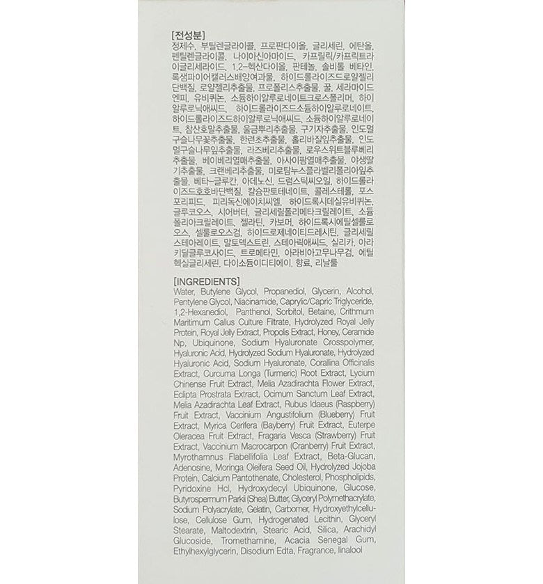 Contains royal lactin, propolis, ubiquinone, and honey to revitalize dry and tired skin.