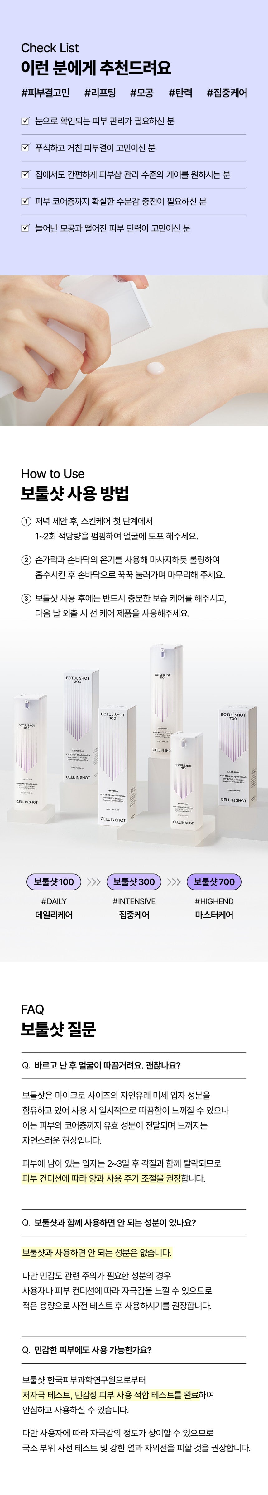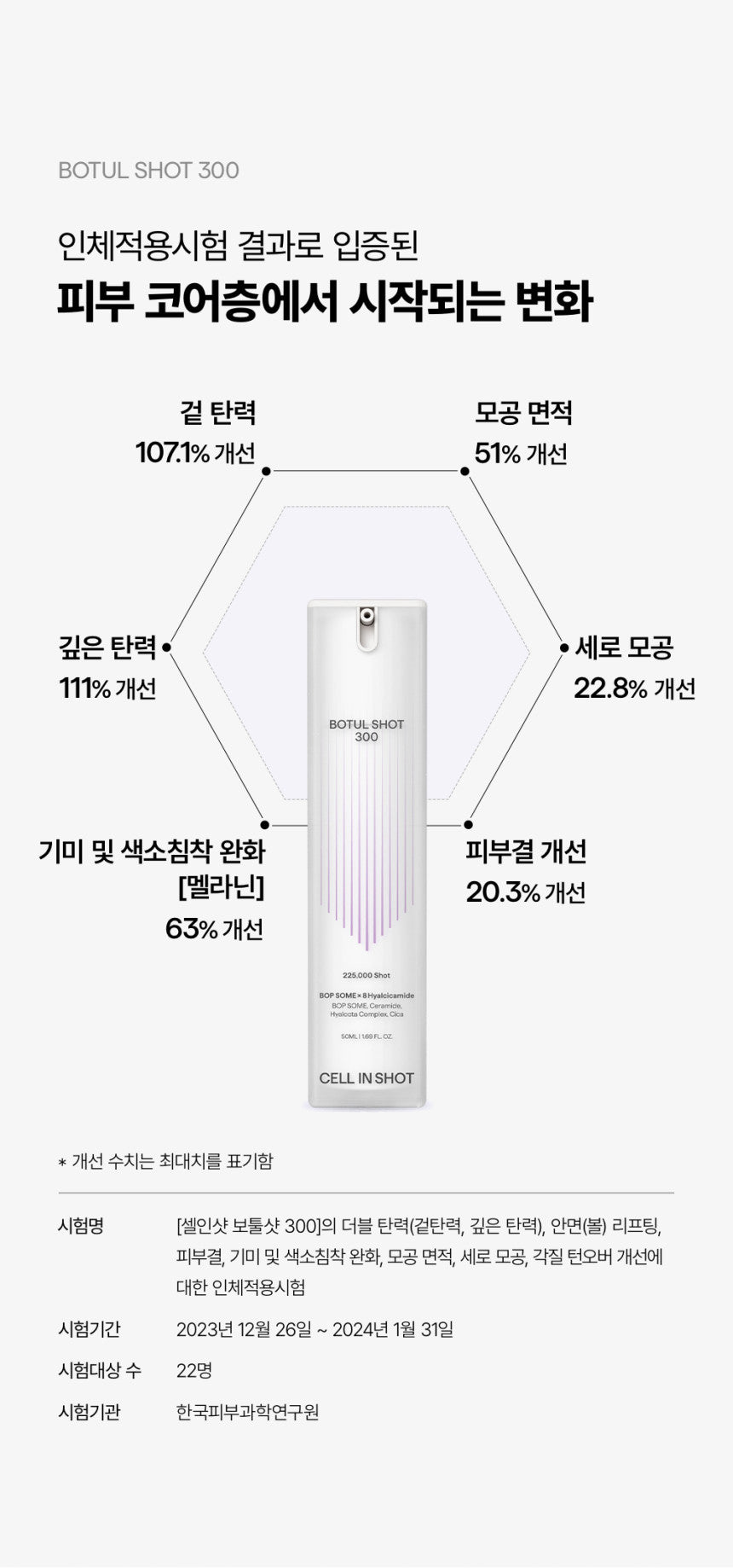 The CELL IN SHOT technology delivers concentrated care with Botulinum Shot 300 (225,000 shots per bottle) to promote visible rejuvenation and deep repair.