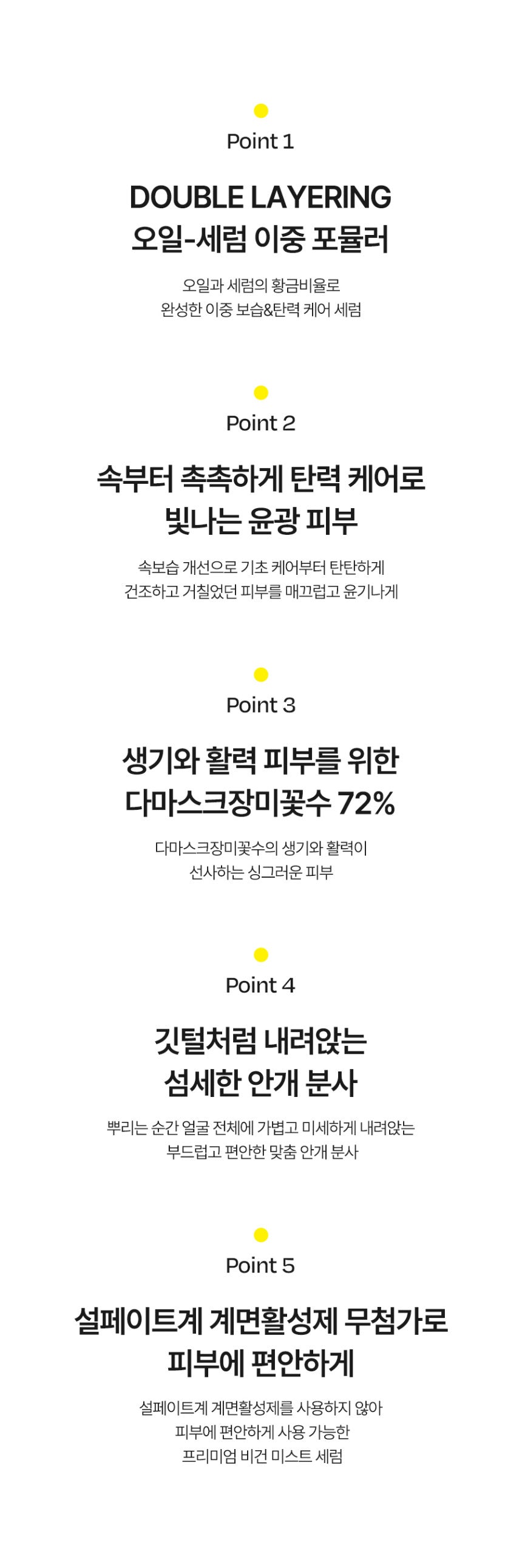 Shake the bottle 3-5 times to mix the oil and serum layers thoroughly before spraying. Hold the bottle 10-20 cm from your face, close your eyes, and mist 4-5 times. Gently pat the serum into the skin for full absorption.