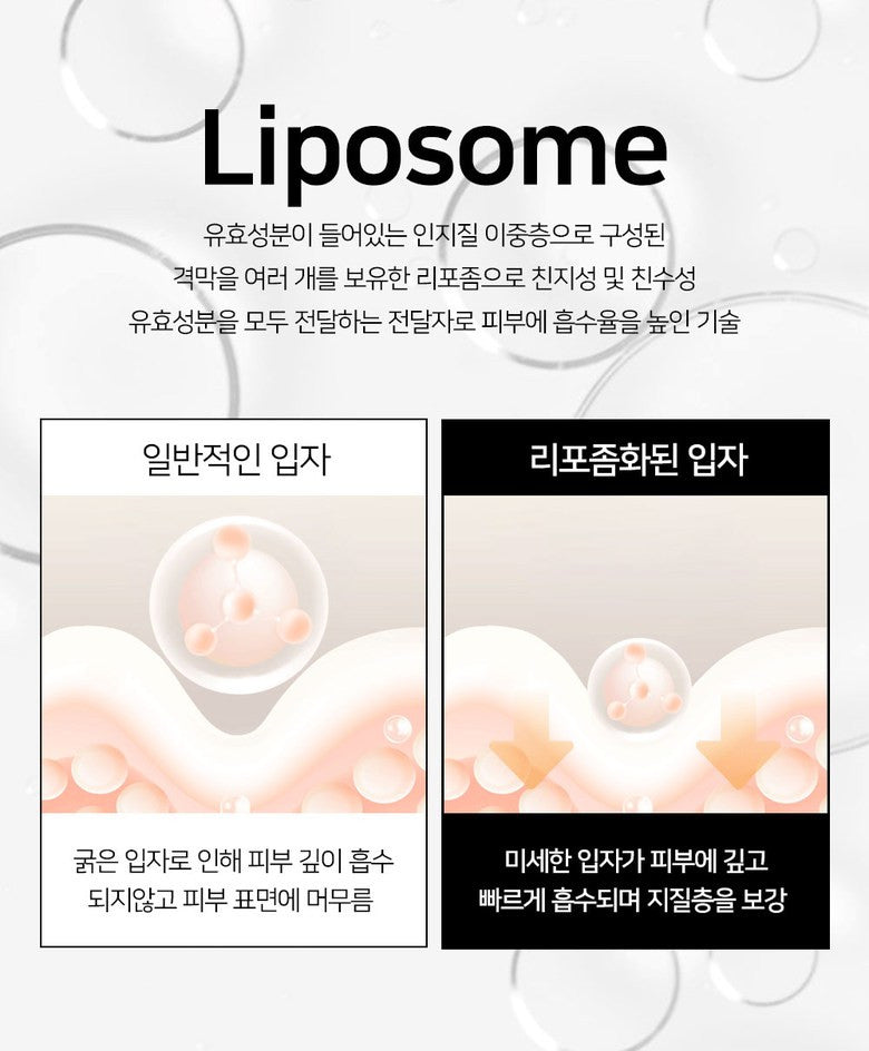 - Advanced Liposome Technology: Ensures deep and rapid absorption of both hydrophilic and lipophilic active ingredients into the skin. This technology uses fine particles that penetrate the skin deeply, ensuring the lipid layer’s integrity and effectiveness.
