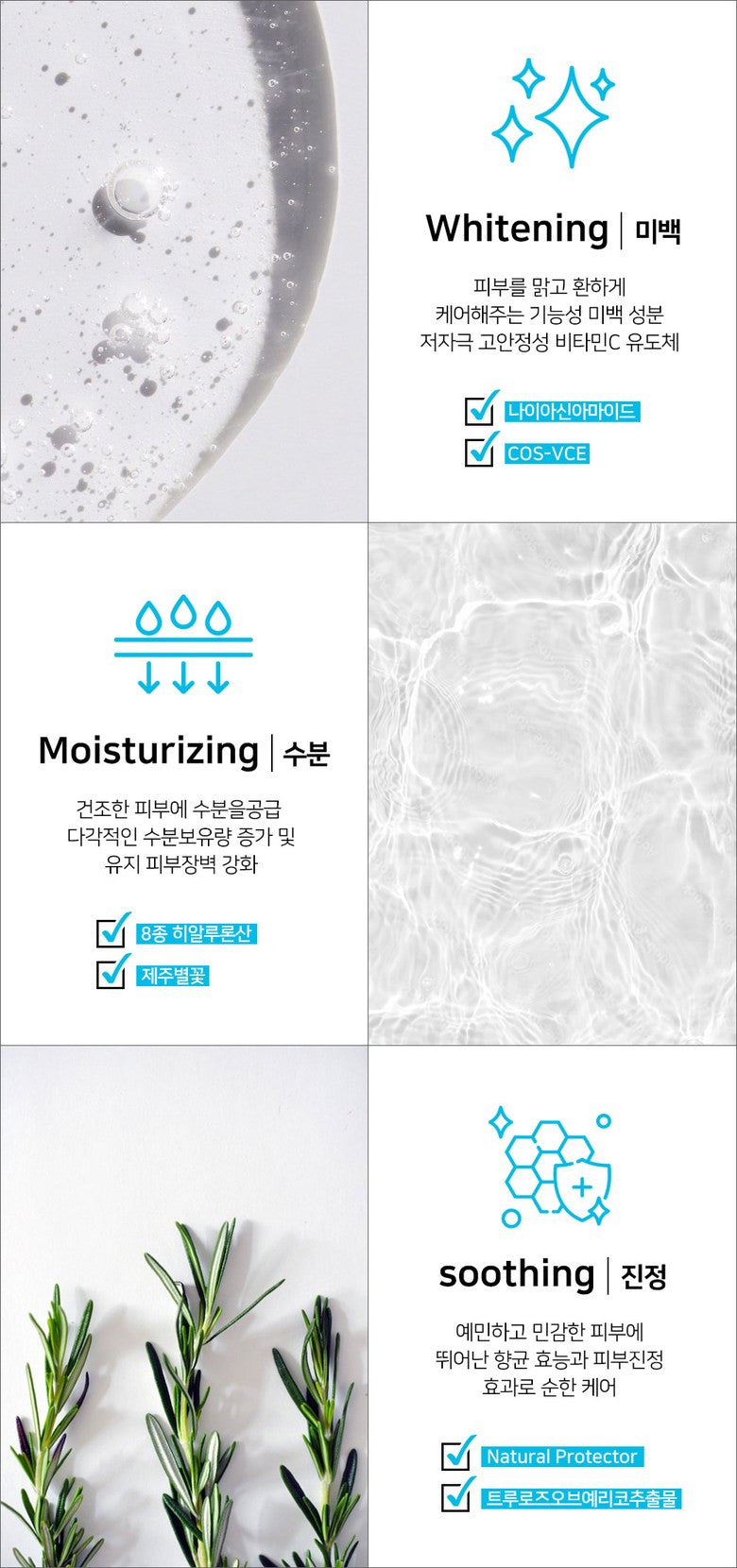 - 8-Layer Hyaluronic Acid, Jeju Bee Flower: Moisturizing, increasing moisture retention, and strengthening skin barrier