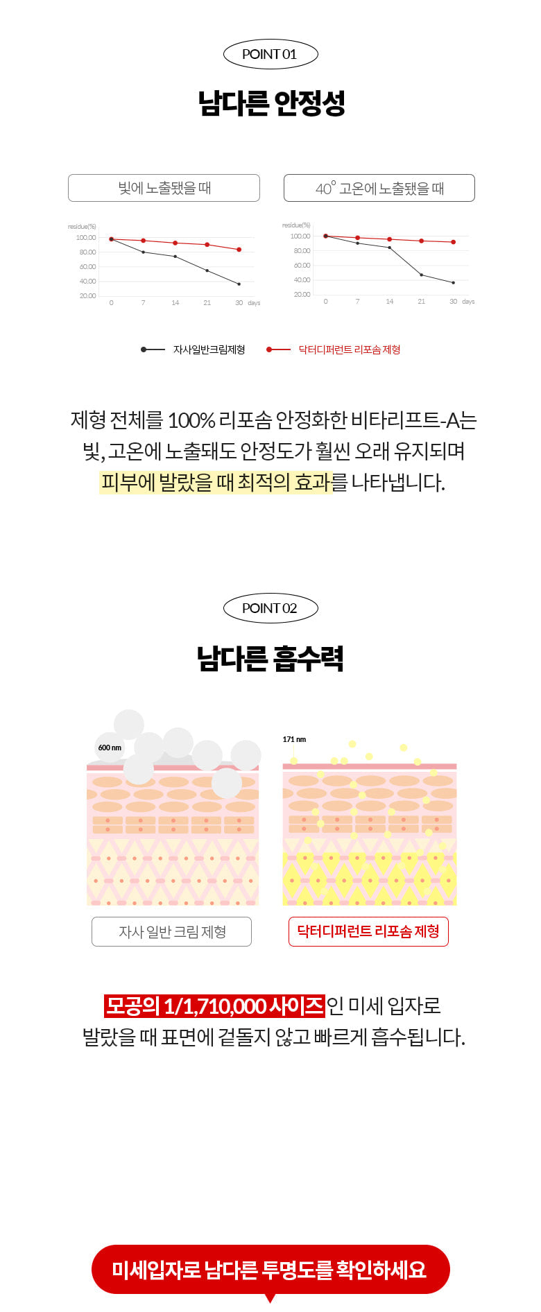 VitaLift-A, whose entire formulation is 100% liposome-stabilized, maintains stability much longer even when exposed to light and high temperatures, and shows optimal effects when applied to the skin.