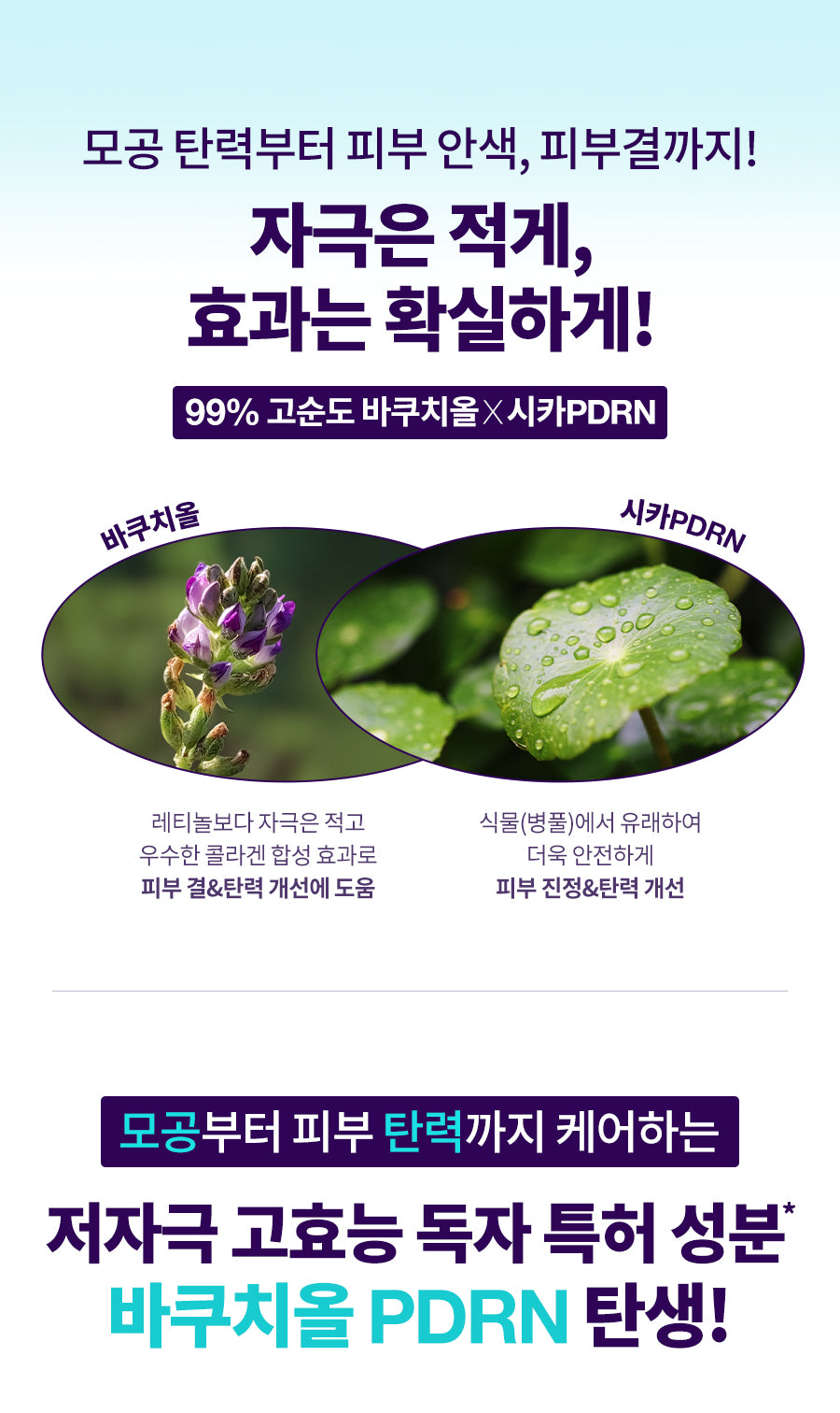 - 99% High Purity Bakuchiol & CicaPDRN: A blend that enhances skin texture and elasticity while soothing the skin and further improving its resilience.