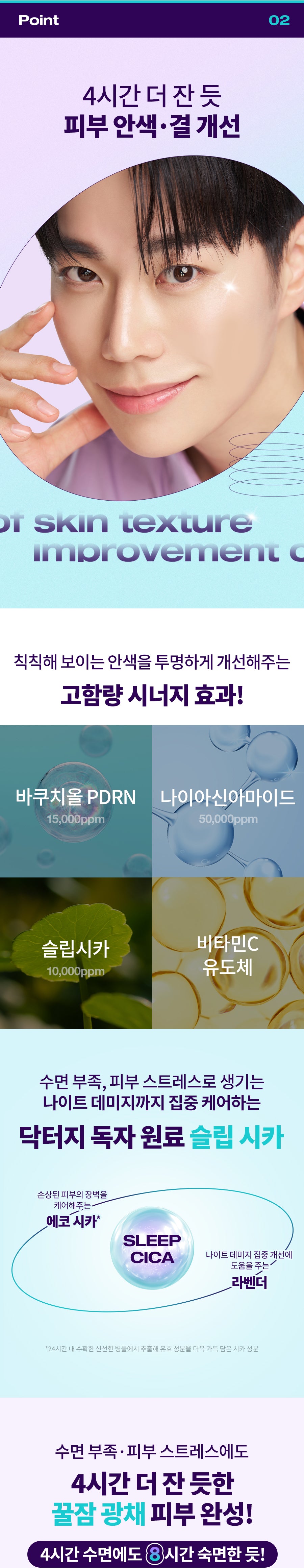 - Point 02: A high-potency blend for improved skin complexion, featuring Bakuchiol PDRN, Niacinamide, Sleepcica, and a Vitamin C derivative for intensive care and barrier improvement.