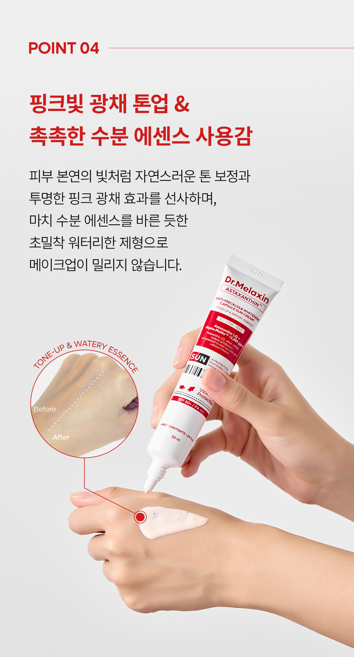 - Features a pinkish glow tone-up effect and a lightweight, ultra-adherent watery texture.
