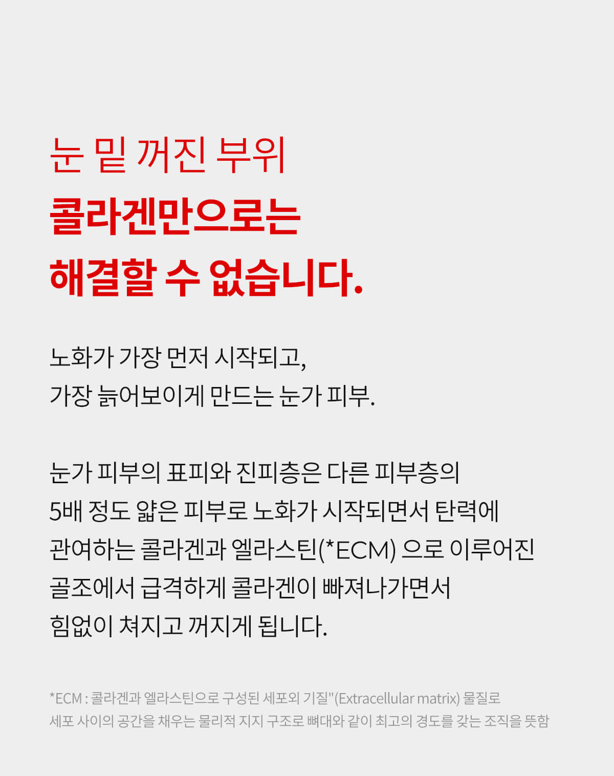 The sunken area under the eyes is not resolved with collagen alone. Aging skin, particularly the delicate nuga skin, demands calcium supplementation. Without calcium, collagen and elastin in the eye structure fail to be retained effectively.