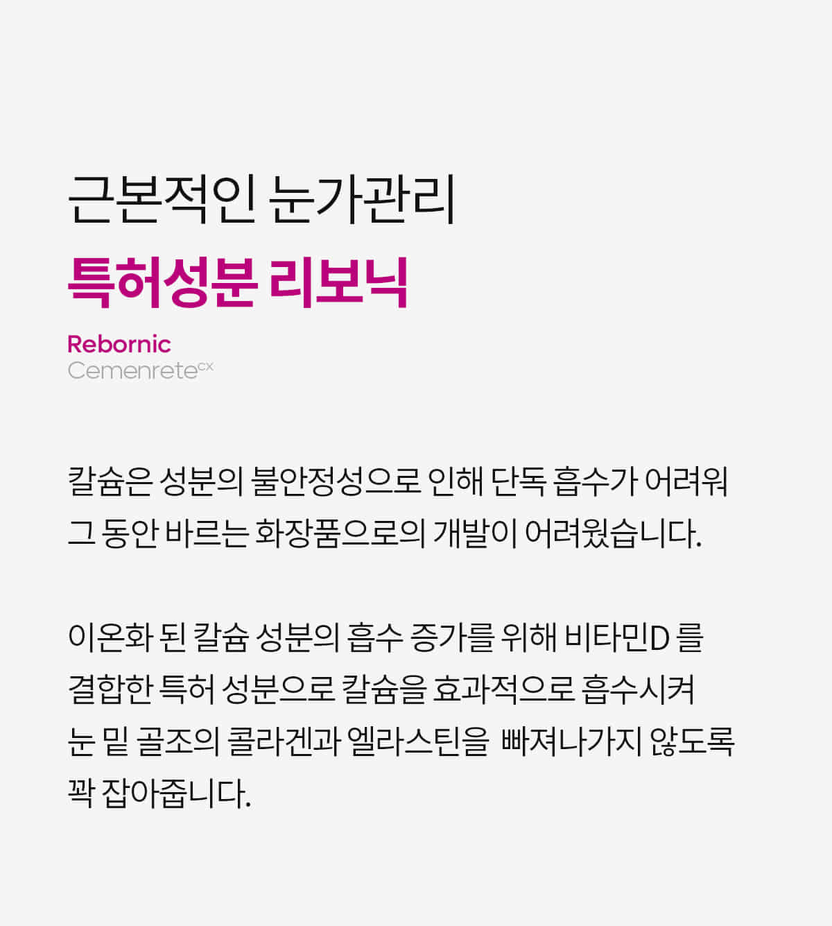 Rebornic’s patented formula ensures deep absorption of ionized calcium, combined with vitamin D, to strengthen and maintain skin elasticity.