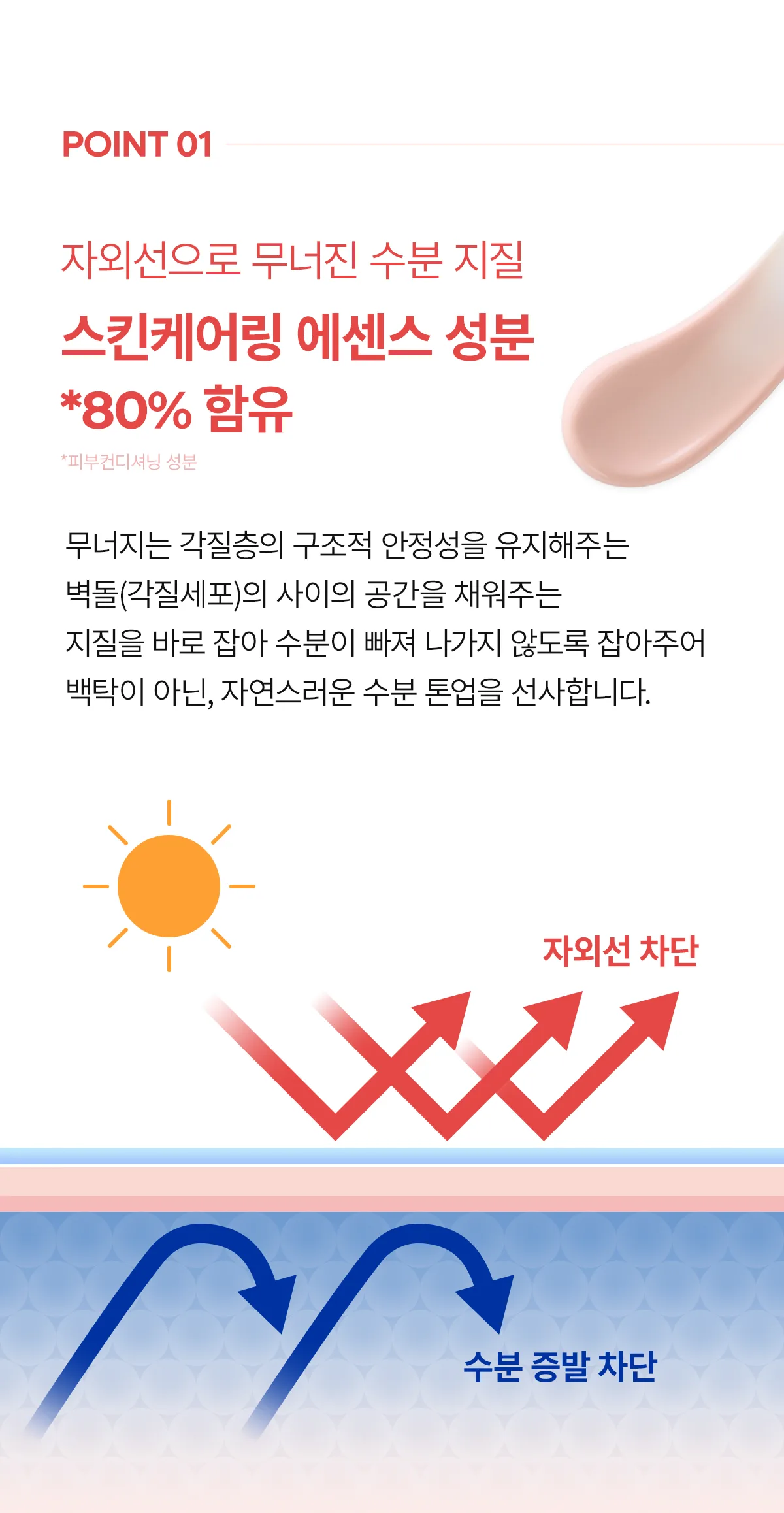 Balances your skin’s moisture with carefully controlled ion concentrations. This allows for rapid absorption and protection against UV-induced dryness.
