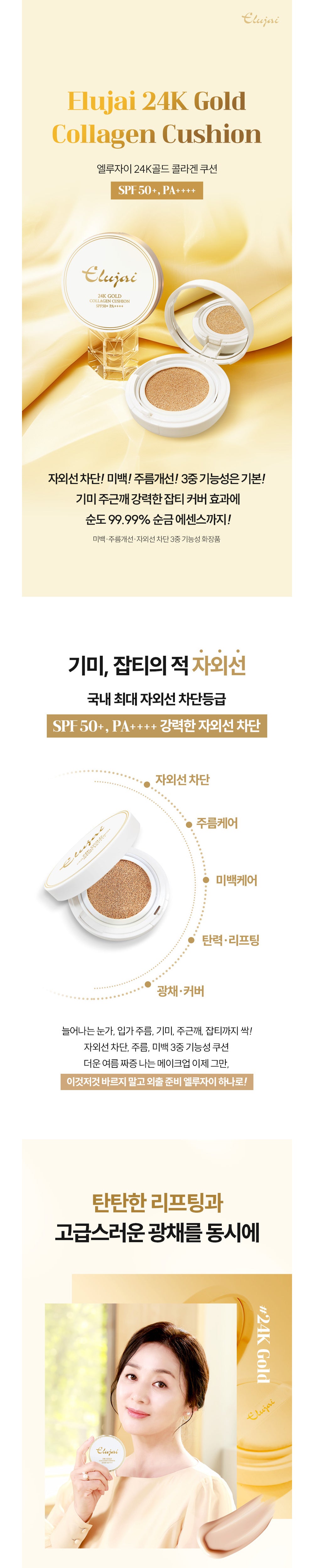 Experience flawless, radiant skin with Elujai 24K Gold Essence Cushion, a triple-function cushion that offers UV protection, whitening, and wrinkle improvement in one easy step. Infused with 99.99% pure gold essence, this cushion provides luxurious skincare benefits while delivering high coverage for blemishes, freckles, and wrinkles.