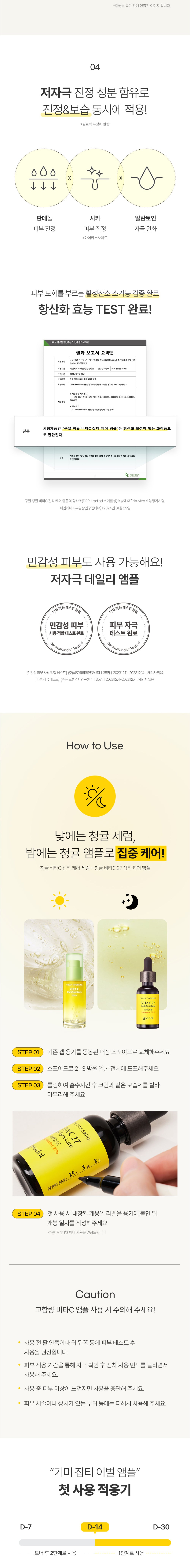 High-concentration vitamin C ampoules require careful usage. It is recommended to perform a patch test on the inner arm or behind the ear before use. Gradually increase usage frequency as your skin adapts. Discontinue use if any skin irritation occurs. Avoid applying on areas with treatments or open wounds.
