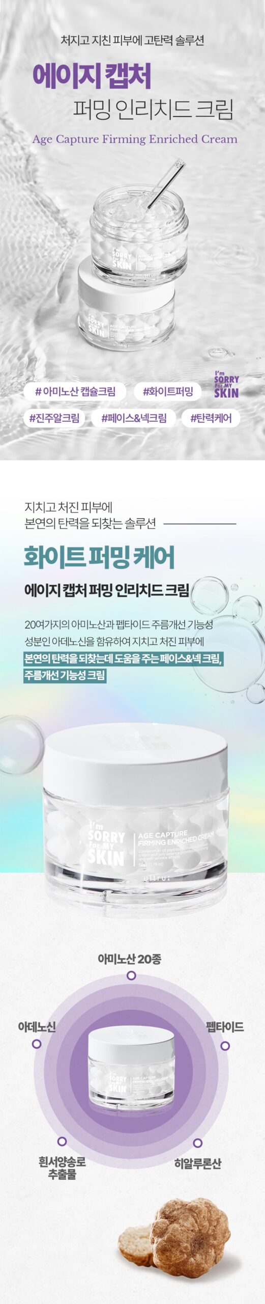 Delve into the world of advanced skincare with ‘I’m Sorry For My Skin Age Capture Firming Enriched Cream’. This cream is specifically formulated for both face and neck, focusing on wrinkle improvement and restoring natural elasticity.