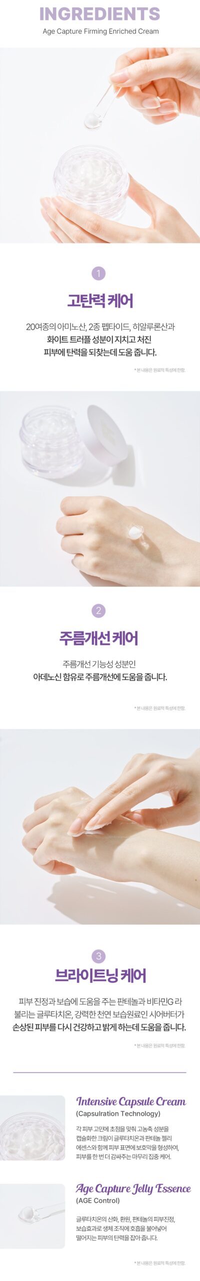 The Age Capture Jelly Essence within the cream utilizes the antioxidative benefits of glutathione and the calming effects of panthenol. This combination aids in maintaining skin elasticity, particularly in aging skin.