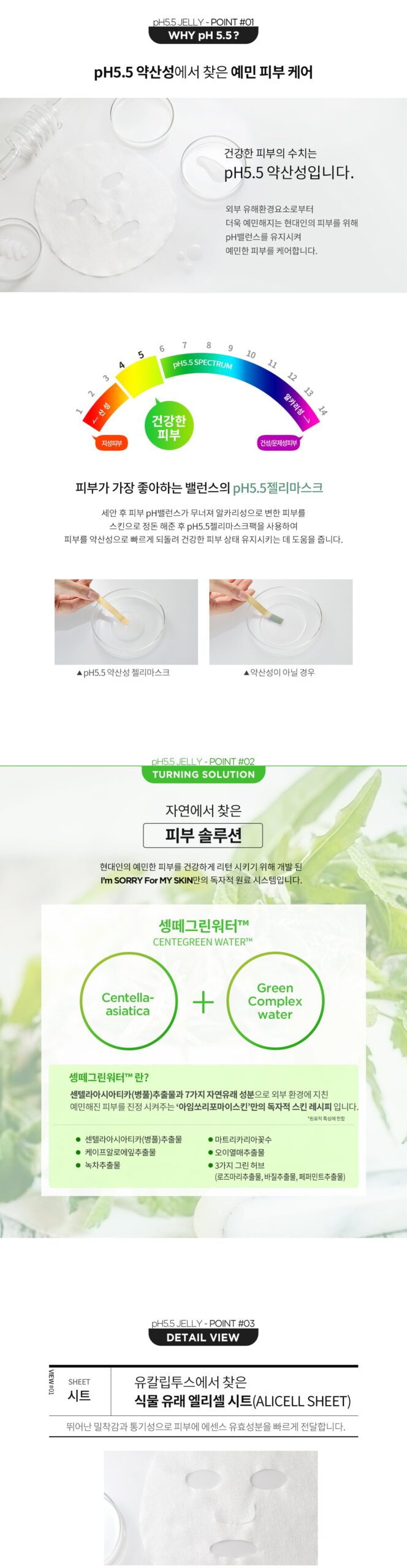 ‘I’m Sorry For My Skin pH 5.5 Jelly Mask – Purifying’ is designed to harmonize the oil and water balance of your skin. This specialized mask soothes irritated skin, restoring it to a naturally healthy state.