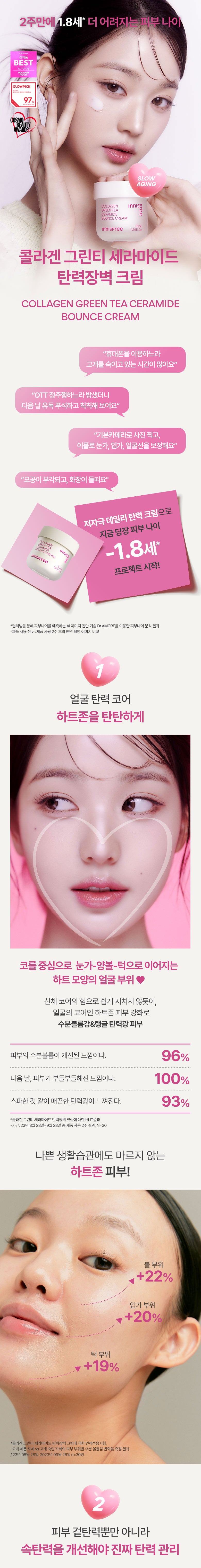 The innisfree Collagen Green Tea Ceramide Bounce Cream is a game changer for my skin. The inclusion of green tea extract not only hydrates but also provides a nice antioxidant boost, making my complexion feel fresher and more vibrant. After using it consistently for three weeks, I noticed a significant improvement in firmness; my skin feels plump without that greasy residue typical of heavier creams. It’s lightweight—just as advertised—which makes it perfect under makeup or worn alone. I definitely recommend this to anyone looking to enhance elasticity and overall skin health.
