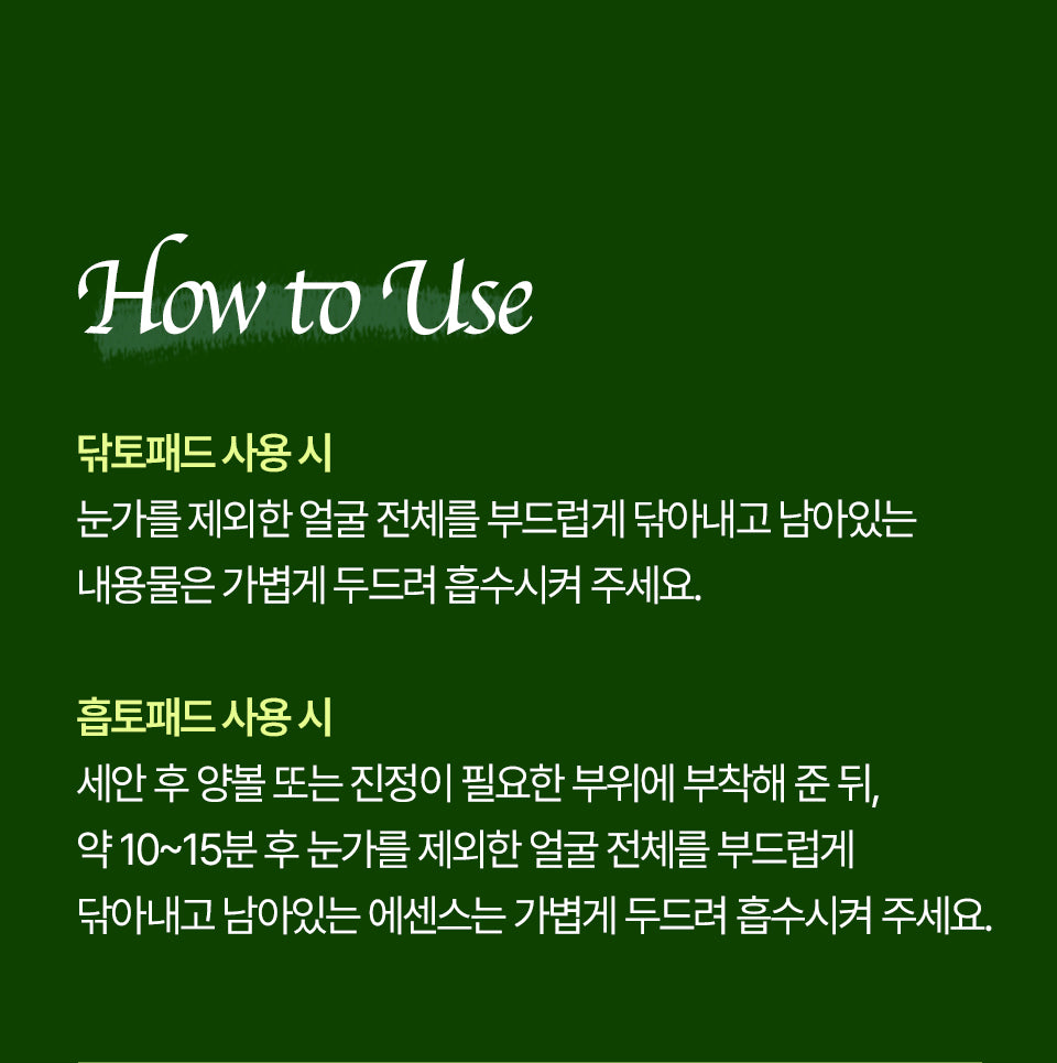 - As a Toner Pack: After cleansing, place the pads on areas that need extra soothing (such as the cheeks) for 10-15 minutes. After removing, gently wipe the face, avoiding the eye area, and pat the remaining essence into the skin.