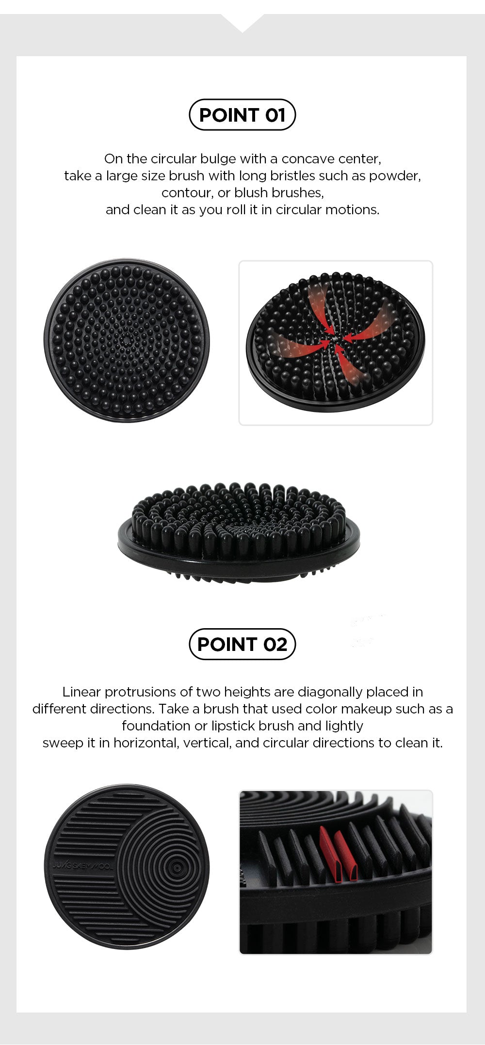 - Point 01: Use the circular bulge with a concave center for larger brushes, such as powder, contour, or blush brushes. Clean these brushes by rolling them in circular motions on the pad.