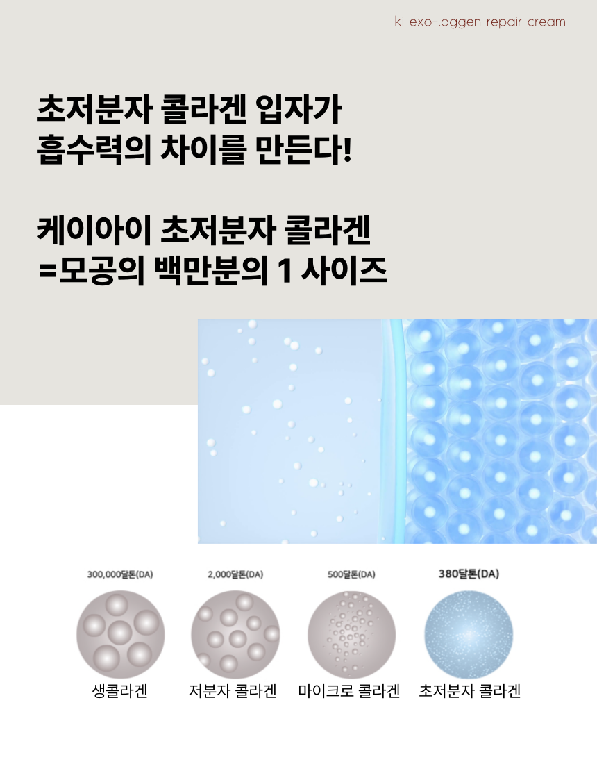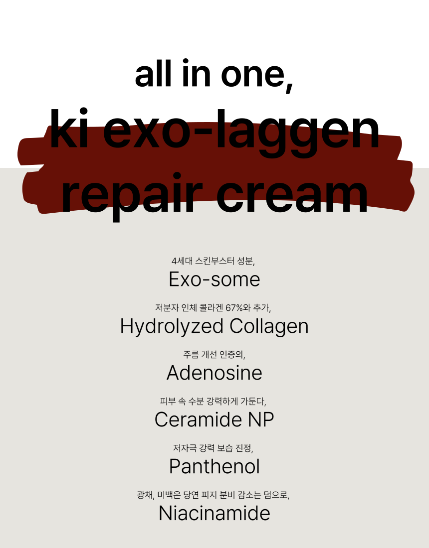 Transform your skincare routine with KI Exo-Laggen Repair Cream, a premium aesthetic-grade cream enriched with ultra-low molecular weight collagen and high-concentration exosomes for rapid absorption and visible results. Unlike conventional creams that use purified water as a base, KI replaces it with a groundbreaking 64% collagen content, ensuring unparalleled nourishment and skin affinity.