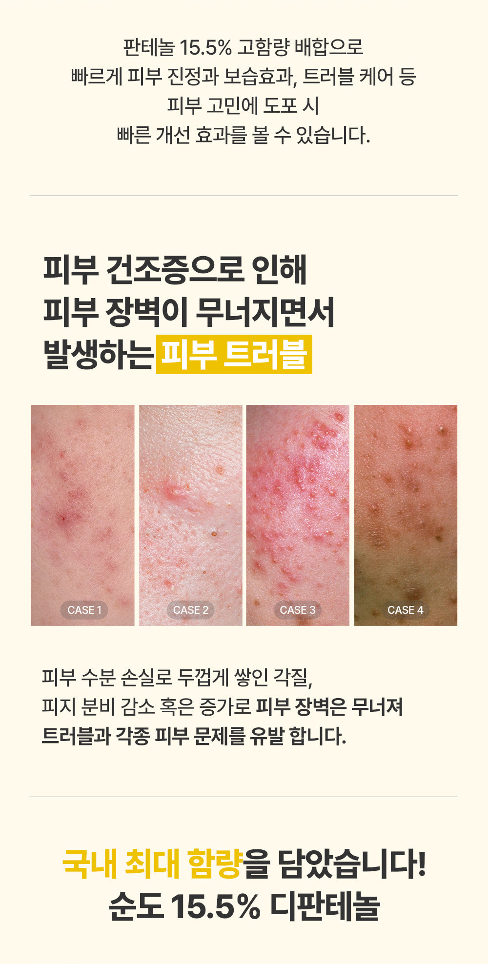 Containing a high content of 15.5% panthenol, you can see quick improvement effects when applied to skin concerns such as quick soothing and moisturizing effects and trouble care.