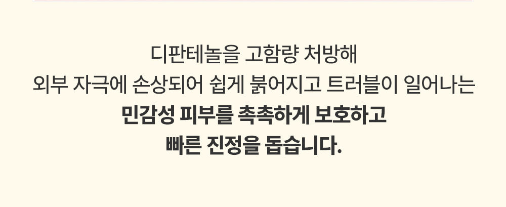 It moisturizes and protects sensitive skin that is damaged by external stimuli and easily becomes red and irritated and helps to quickly calm down.