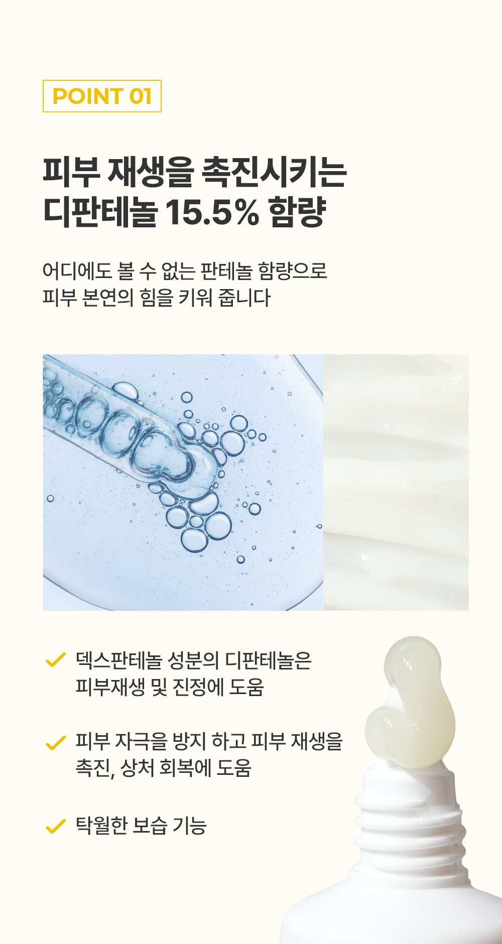 Containing a high content of 15.5% panthenol, you can see quick improvement effects when applied to skin concerns such as quick soothing and moisturizing effects and trouble care.