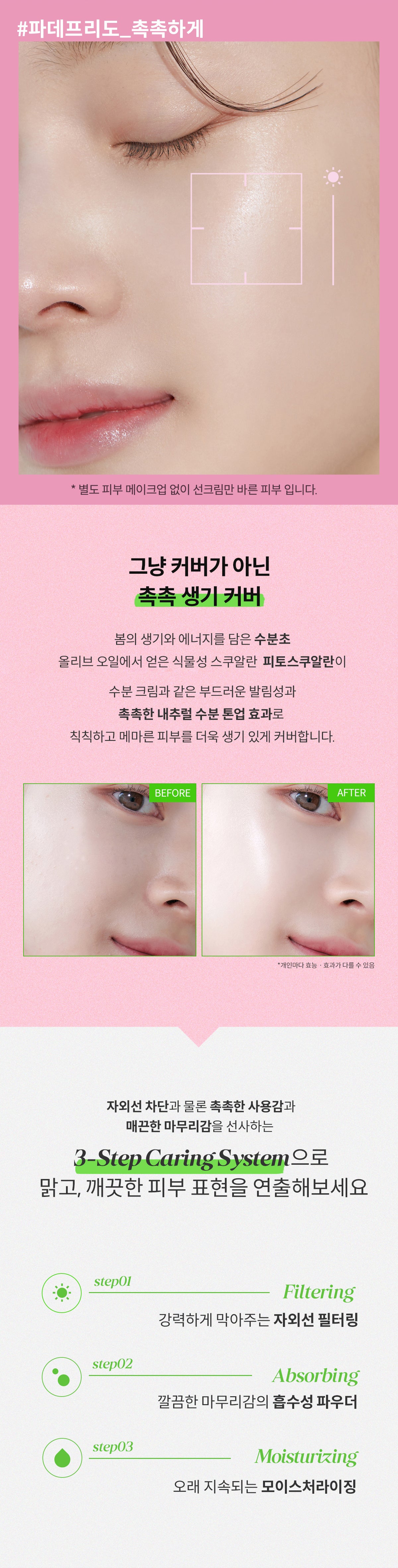 With a 3-step caring system that offers strong UV protection, a smooth absorption powder for a clean finish, and long-lasting moisturization, it creates a clear and clean skin expression.