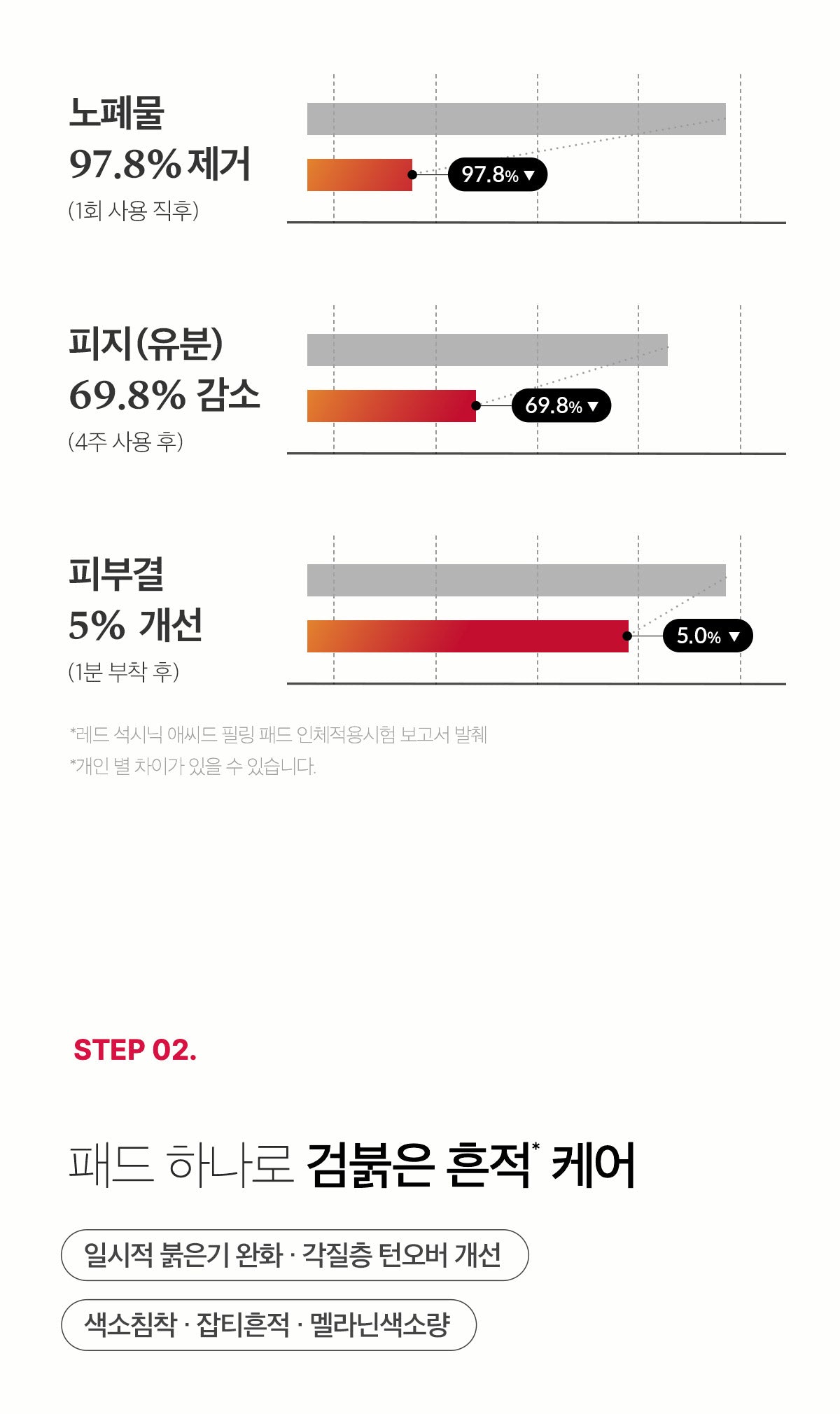 Our peeling pad leverages a refreshing water formula that minimizes irritation and stickiness, making it perfect for daily use. The dual erasing system not only removes waste and sebum but also significantly alleviates dark red marks, offering an intensive care option by simply attaching it to problem areas for a minute.