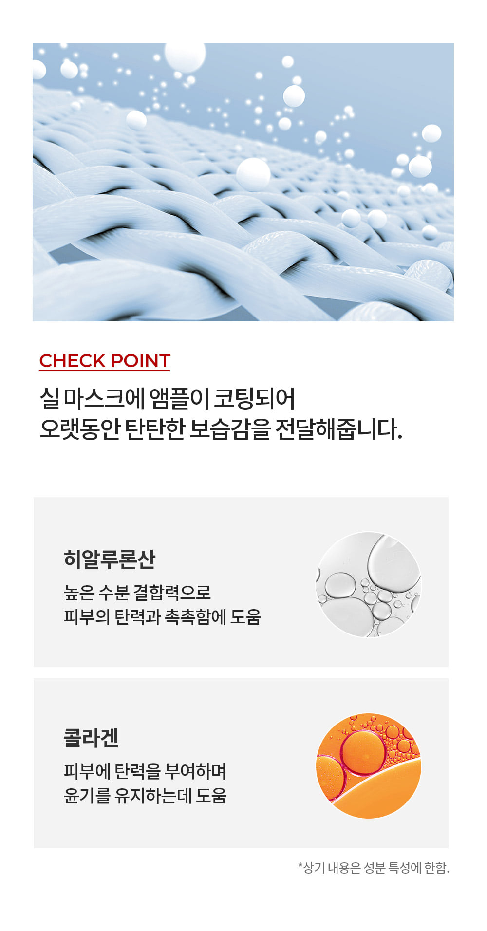 The mask sheet contains collagen and hyaluronic acid, filling the skin with elasticity.