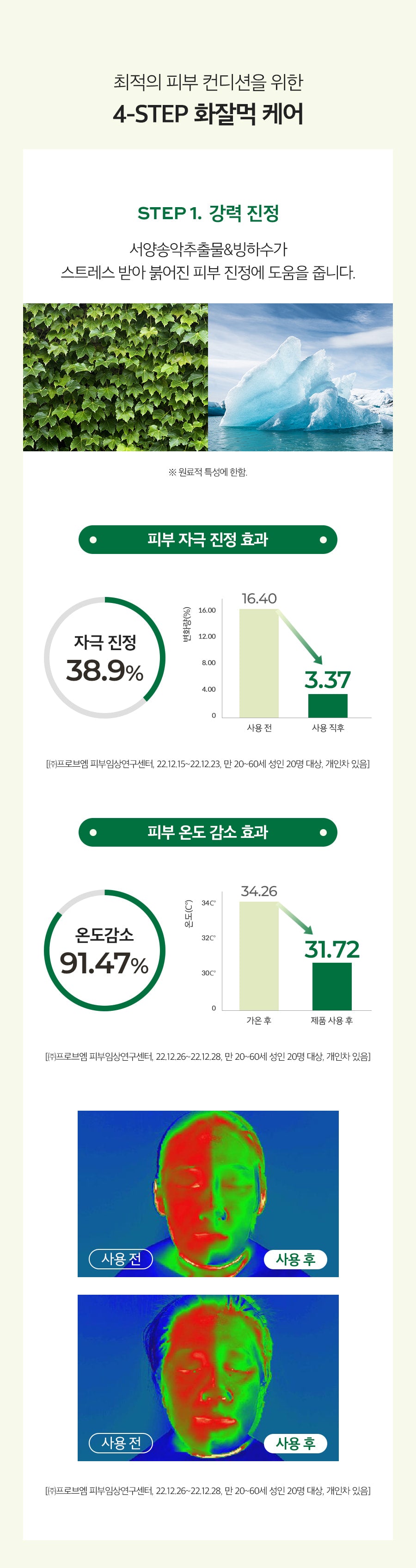 - Strong Soothing: Hedera Helix Extract and Glacier Water reduce skin temperature by 91.47% and soothe by 38.9%.