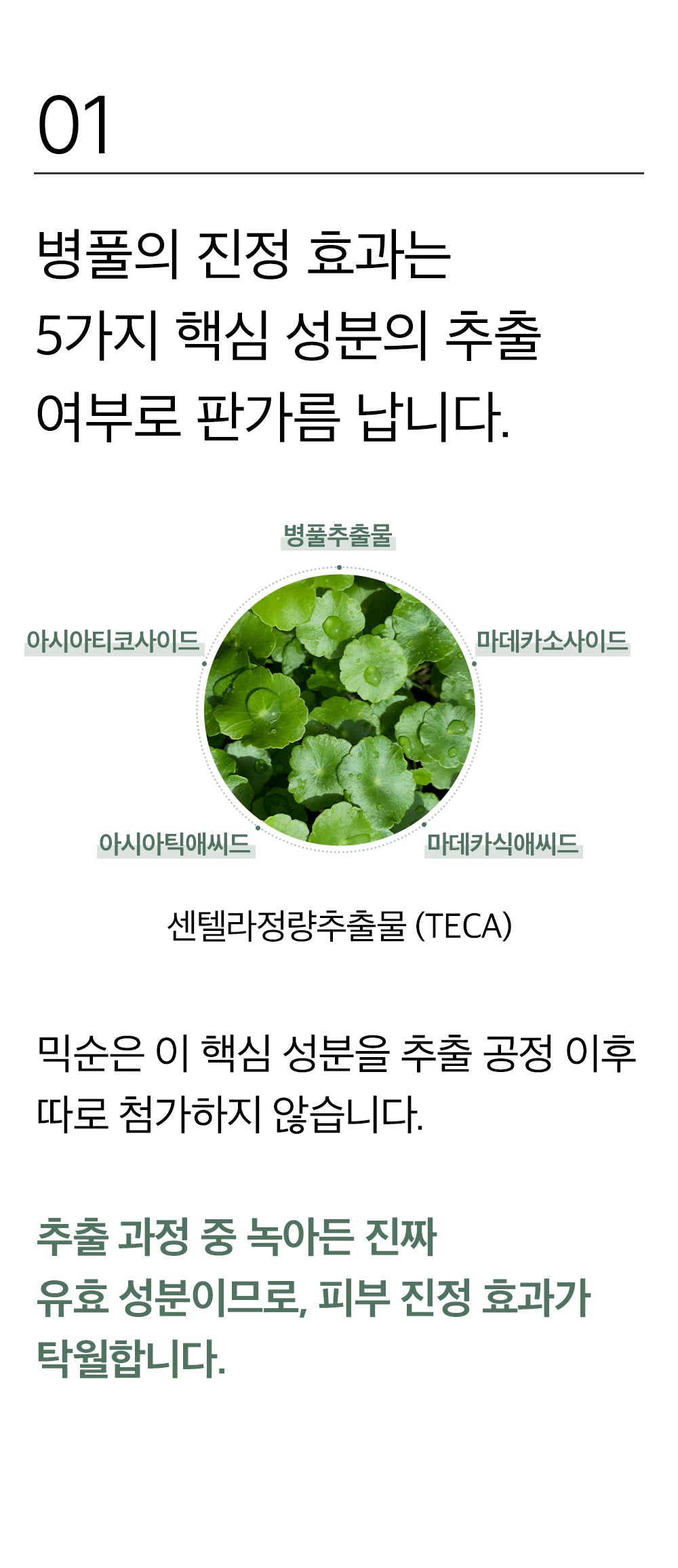 - Centella Asiatica Extract & TECA: This core ingredient, not added separately but infused during the extraction process, offers exceptional skin soothing effects.