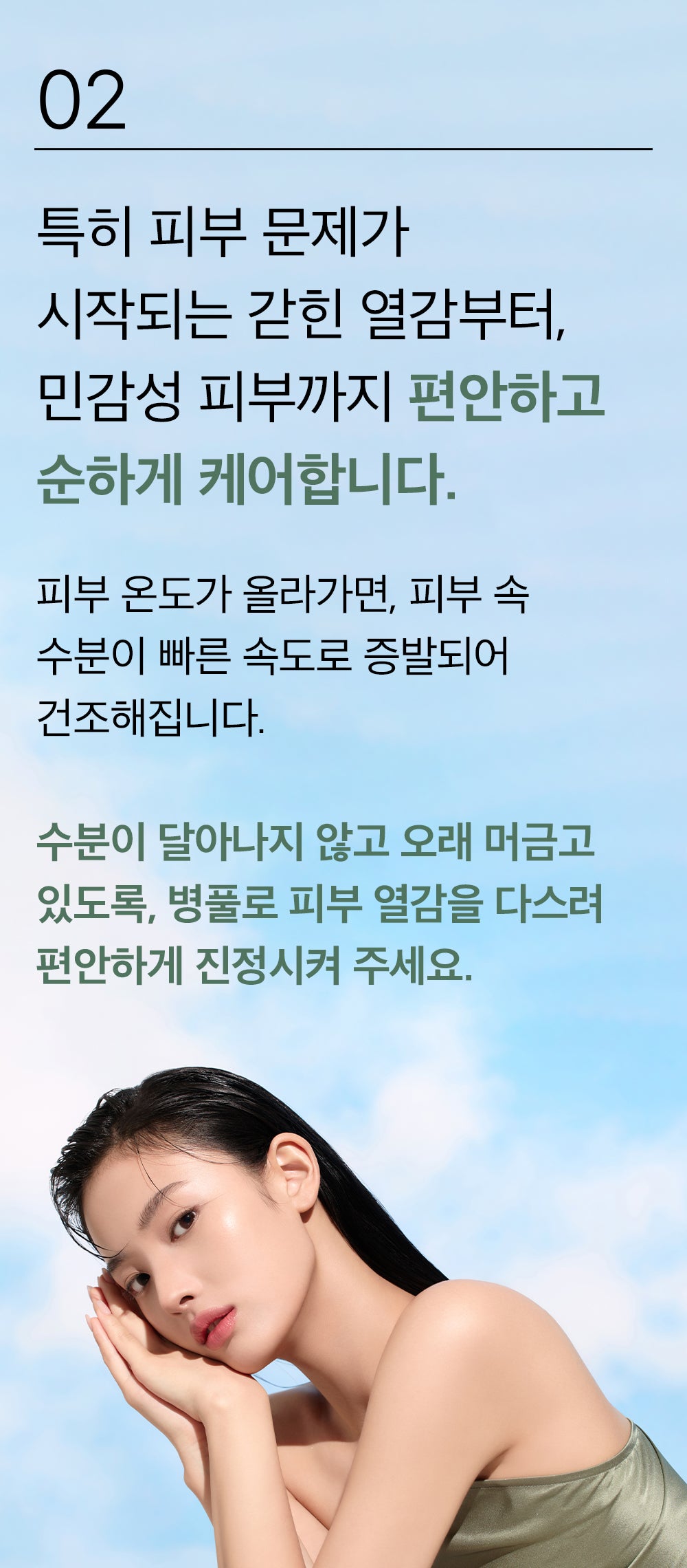 - Centella Asiatica: Effectively treats skin heat and soothes sensitive skin.