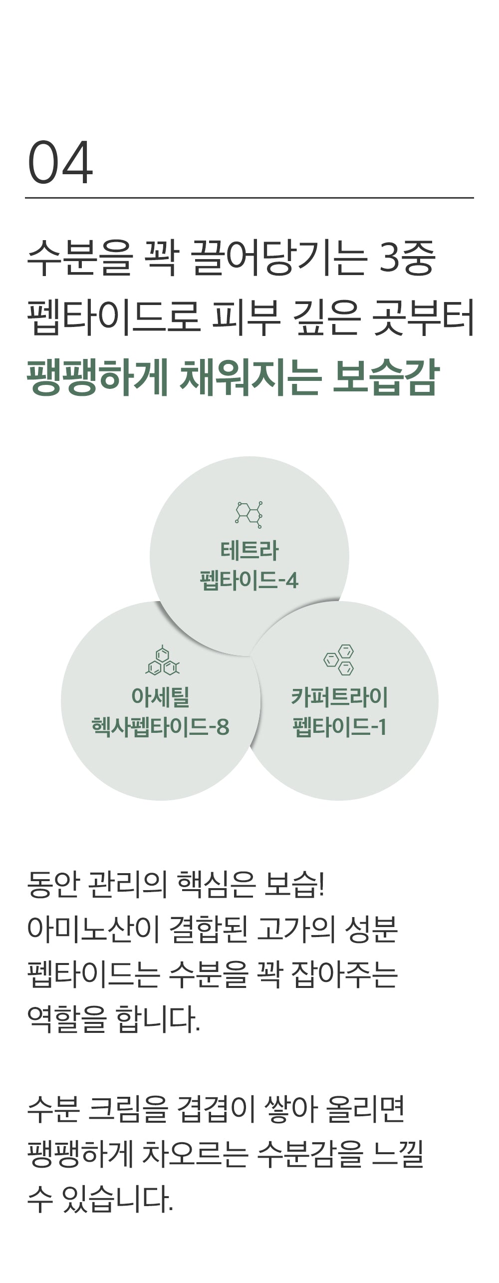 - Tetra Peptide-4, Acetyl Hexapeptide-8, Copper Tri Peptide-1: These peptides deeply hydrate, promoting youthful skin.