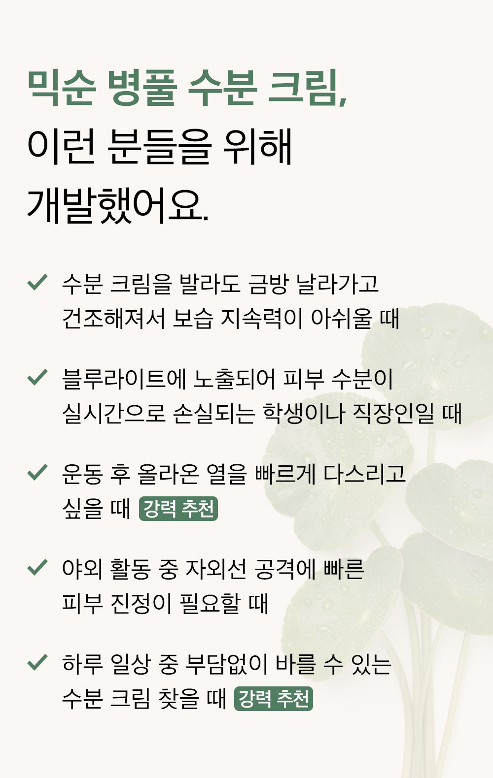 - Centella Asiatica: Effectively treats skin heat and soothes sensitive skin.