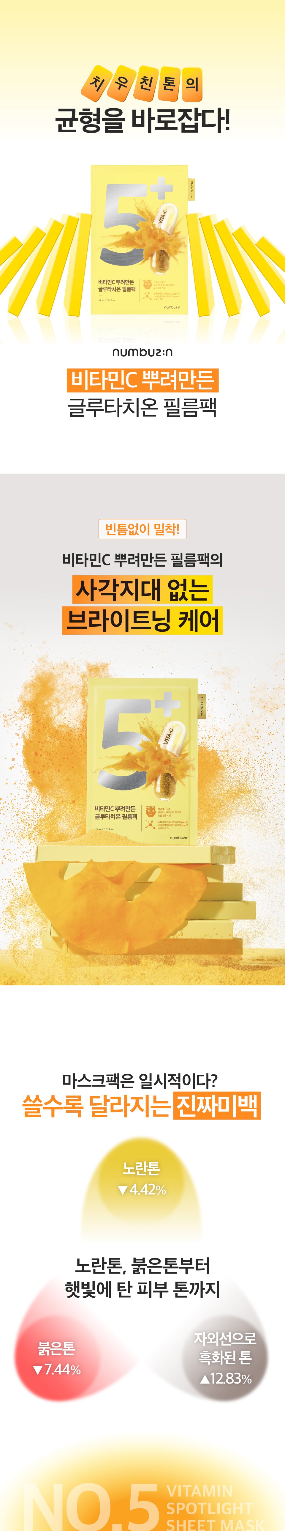 Experience a new level of skin radiance with the Numbuzin No. 5 Vitamin Spotlight Sheet Mask. This advanced whitening mask is designed to transform your skin, delivering clear, luminous results. The unique yellow film sheet, infused with Vitamin C, is meticulously coated with a highly concentrated Glutathione C ampoule, ensuring an exceptional brightening effect.