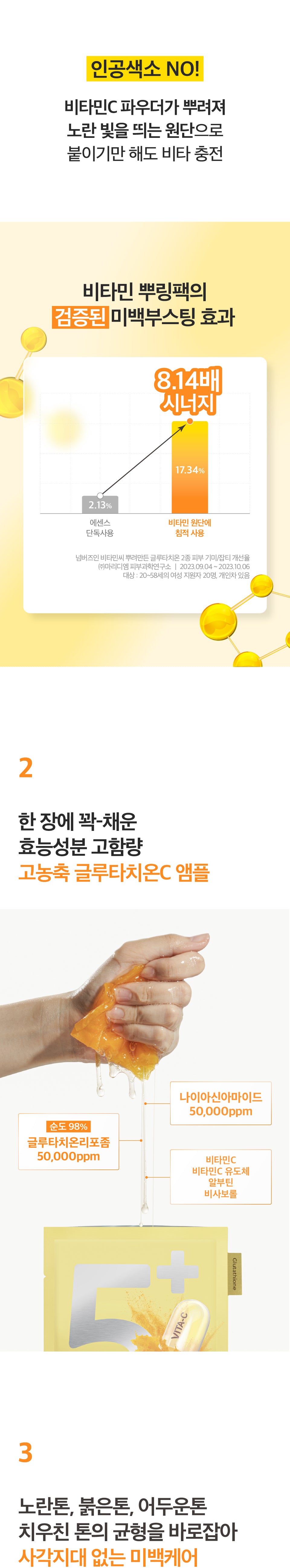 The innovative film pack is sprayed with Vitamin C, providing comprehensive brightening care. This real skin enhancer improves skin yellowness by 4.42%, redness by 7.44%, and counters tanned skin by 12.83%. Experience a remarkable 8.14 times increase in brightening synergy with this Vitamin C enriched formula.