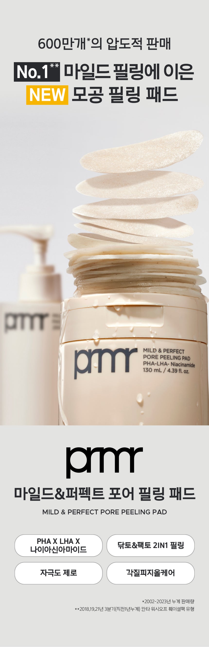 Introducing the all-new Mild & Perfect Pore Peeling Pads, designed to provide gentle yet effective peeling with a focus on pore care. Combining the exfoliating power of PHA, LHA, and Niacinamide, this dual-action pad offers both toning and peeling in one convenient step to leave your skin refined, clear, and ready for flawless makeup application.