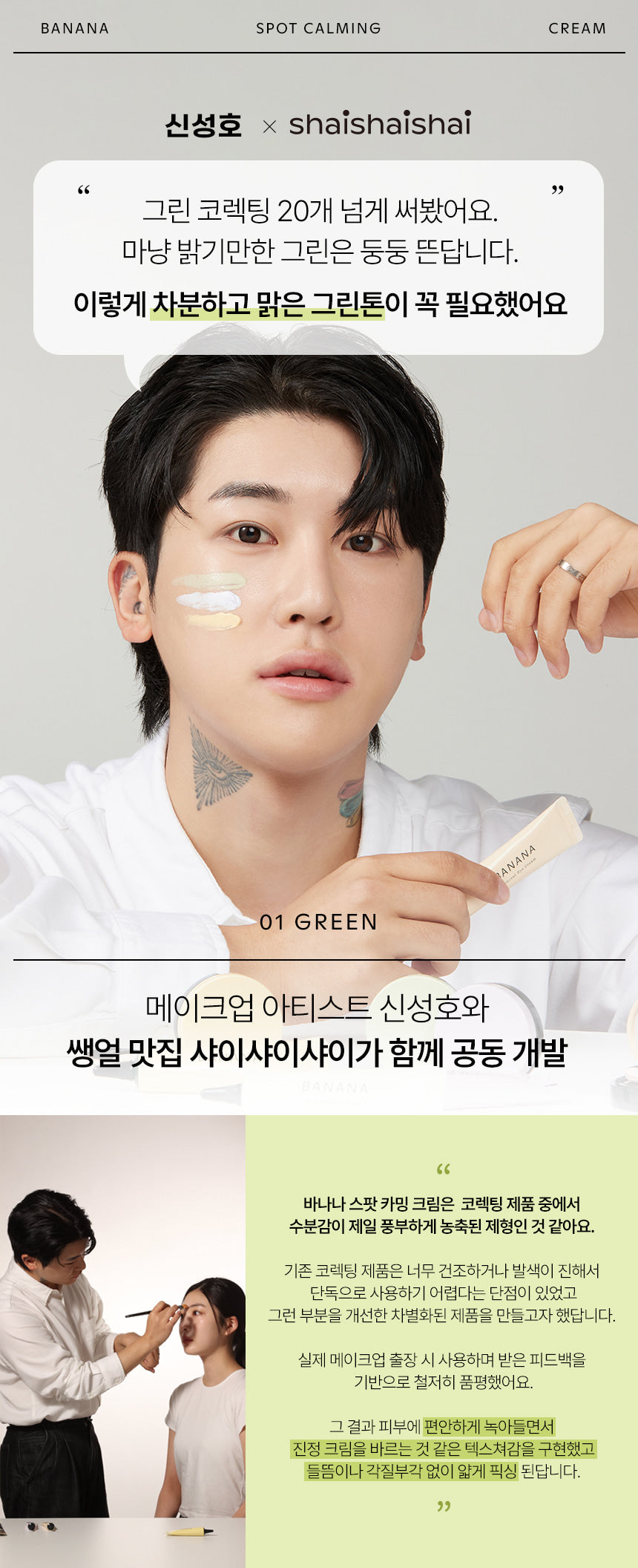Renowned makeup artist 신성호 and beauty brand shaishaishai teamed up to create the perfect green correcting cream. After testing over 20 green correction formulas, they nailed a calm, clear green tone that neutralizes redness without the unnatural brightness found in typical products.