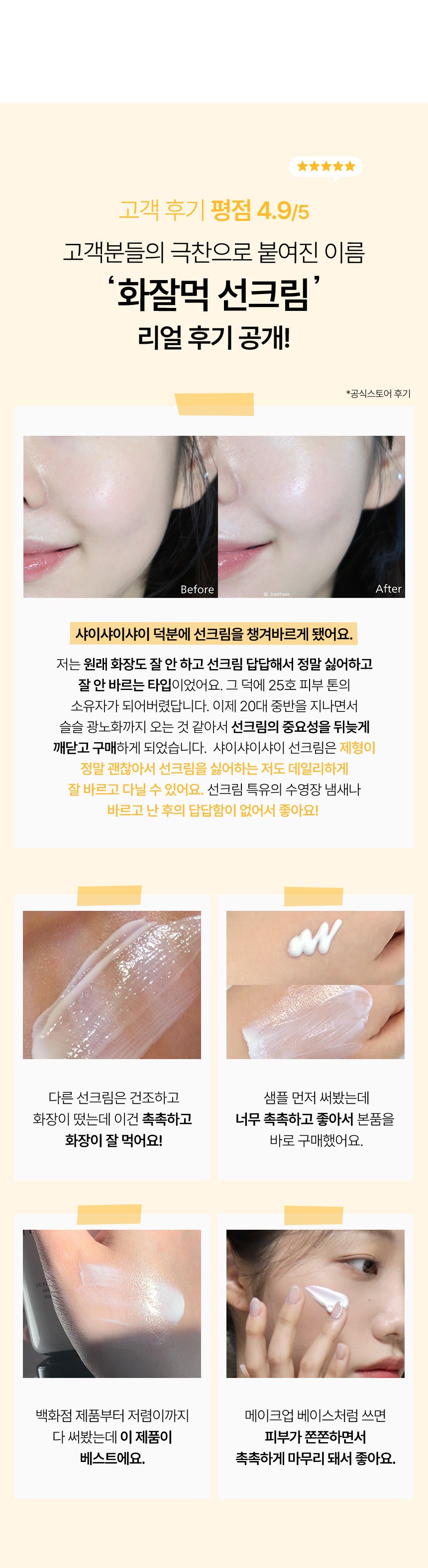 私は普段、紫外線対策を欠かさないために様々なサンブロックを試してきましたが、このshaishaishai Enjoy the Sun UV Protection Creamは思った以上でした。見た目からも期待感でワクワクしながら使ってみると、その軽やかなテクスチャーには驚愕!化粧崩れの心配なしで1日中快適だった上に、素肌にも嬉しい潤い補給があったとは信じられません。本当にクリーム特有のベタつき感が全くなく、お気に入りになりそうです。この商品は間違いなく自分の日常コスメとして必須アイテムになるでしょう。