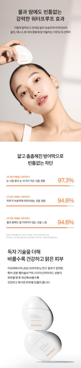 Discover the epitome of sun protection with Sulwhasoo’s UV Daily Fluid Sunscreen Multi-protection SPF50+ PA+++, a premium sunscreen designed to offer robust, waterproof protection that stands up to water and sweat with ease. Ideal for outdoor activities like golf and tennis, this sunscreen ensures a seamless blend into your skin without leaving any residue, providing a soft and smooth finish perfect for any adventure.