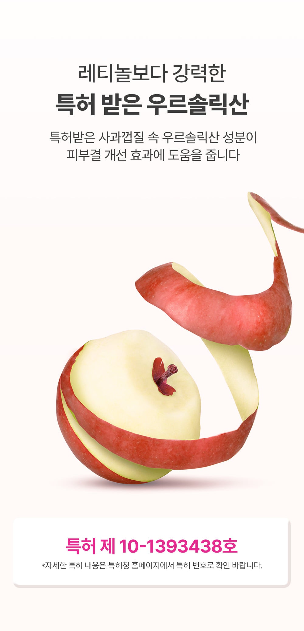 Experience the soothing power of the patented ursolic acid extracted from smooth apple peels. This ingredient transforms rough skin into a soft, smooth complexion without irritation.
