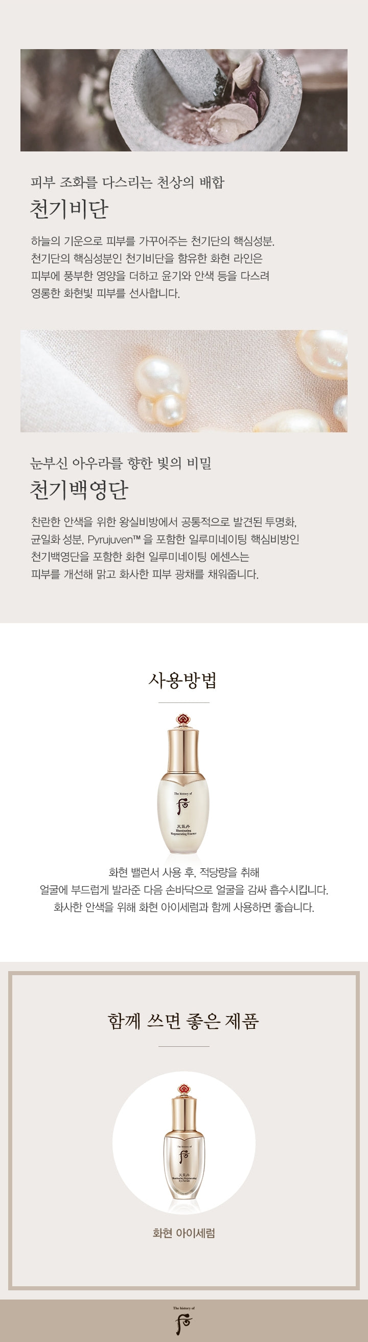 Hwahyun Illuminating Essence, which contains Cheongibaekyeongdan, the key illuminating secretion and Pyrujuven™, a clearing and equalizing ingredient commonly found in royal secrets for a radiant complexion, improves the skin and fills it with a clear and bright skin glow.
