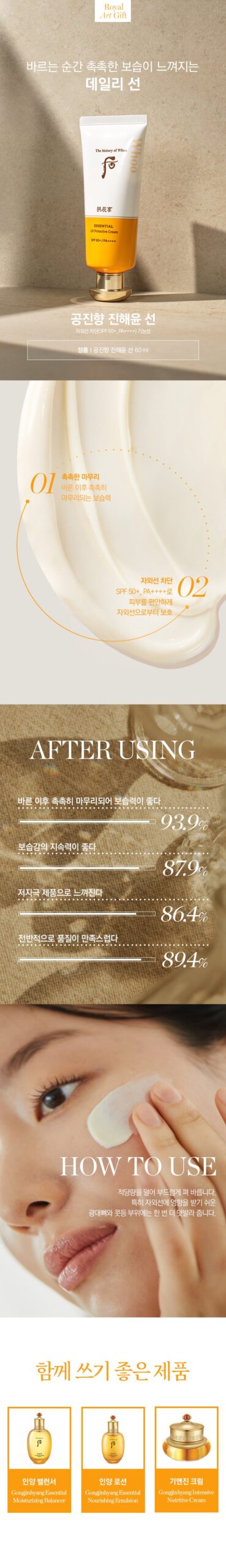 Make THE WHOO Gong Jin Hyang Jin Hae Yoon Moisture Sun Cream your ultimate daily defense against UV rays while enjoying the luxurious benefits of traditional Korean skincare.