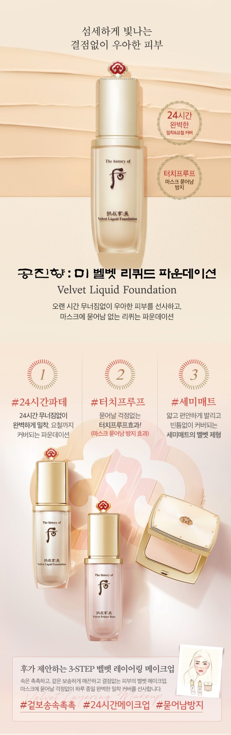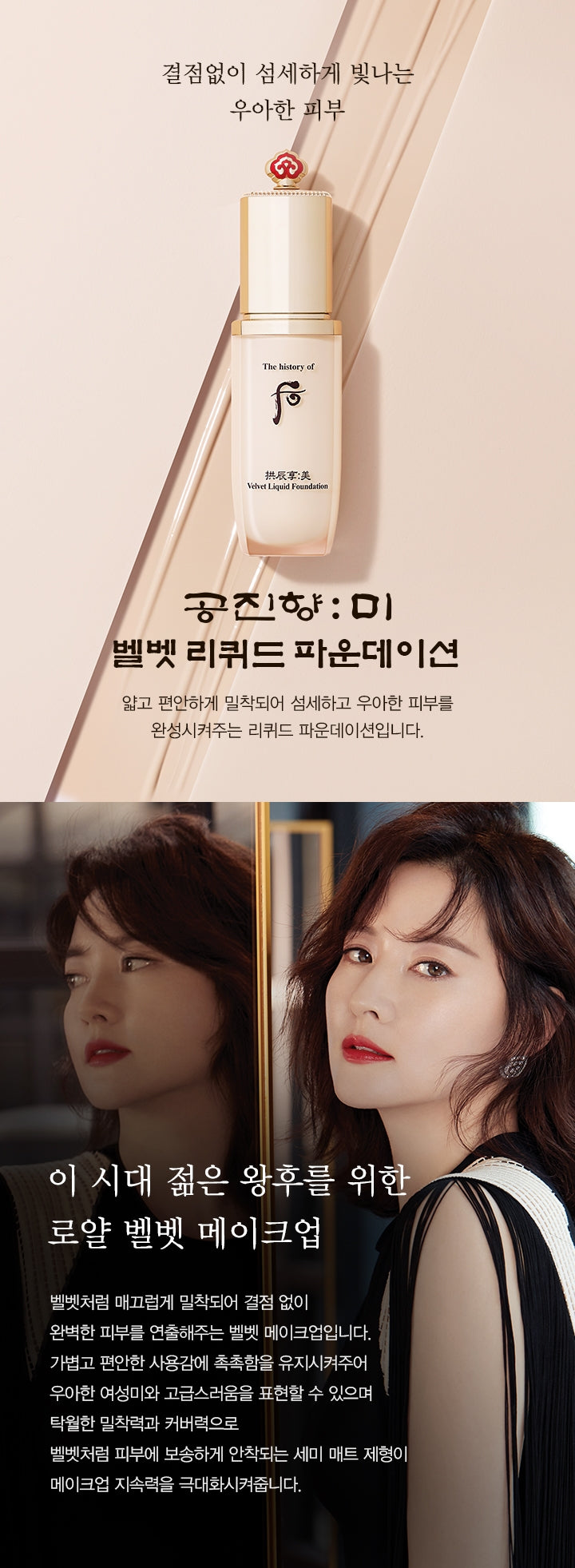 It maintains light and comfortable moisture to express elegant femininity and luxury, and the semi-matte formulation that adheres to the skin like velvet with excellent adhesion and coverage maximizes makeup durability.