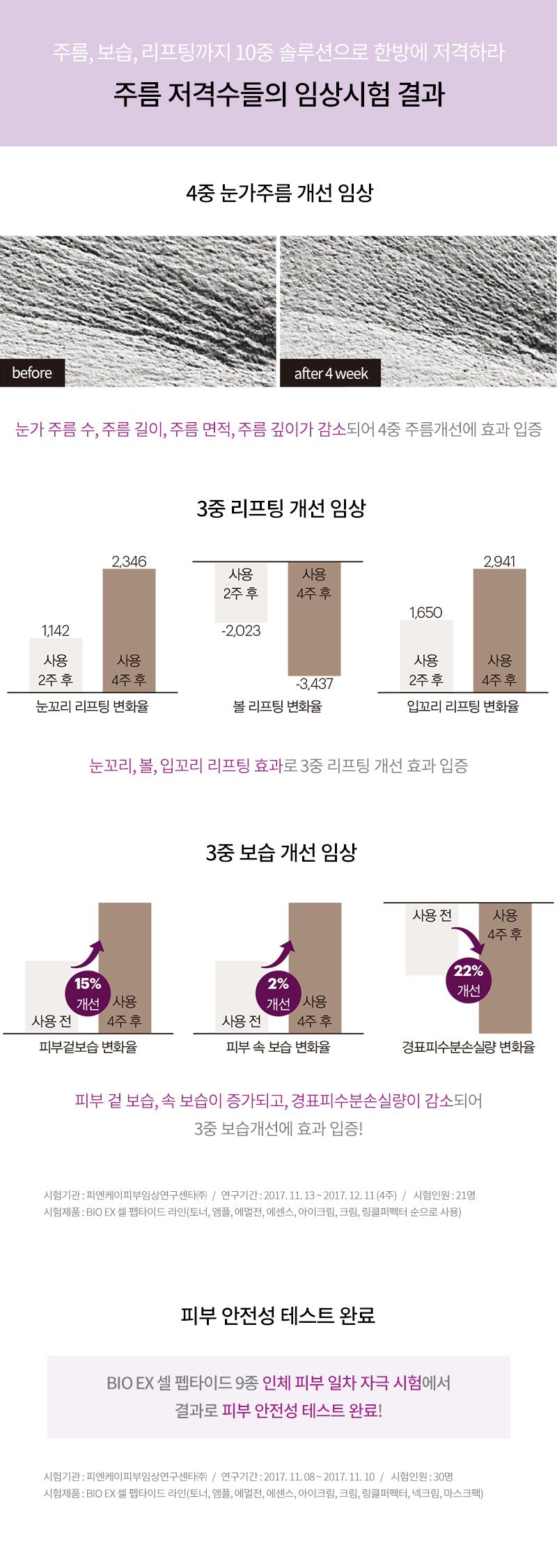 Our clinical trials speak volumes, offering a comprehensive solution for wrinkles, moisturization, and lifting—all in one. Witness a significant reduction in the appearance of wrinkles, including their number, length, area, and depth, alongside a notable improvement in skin moisture, both externally and internally, and a triple lifting effect that elevates the corners of the eyes, cheeks, and mouth.